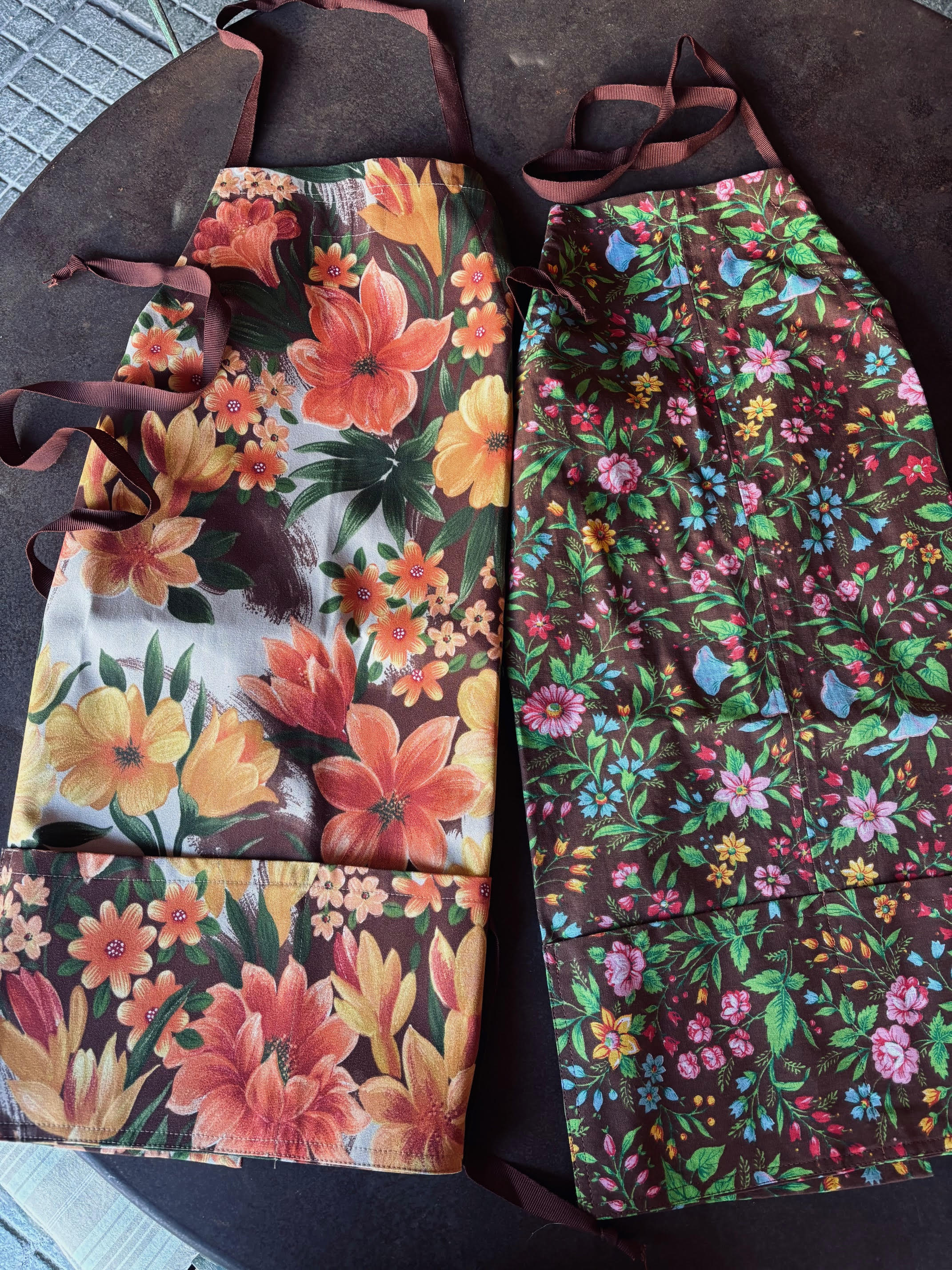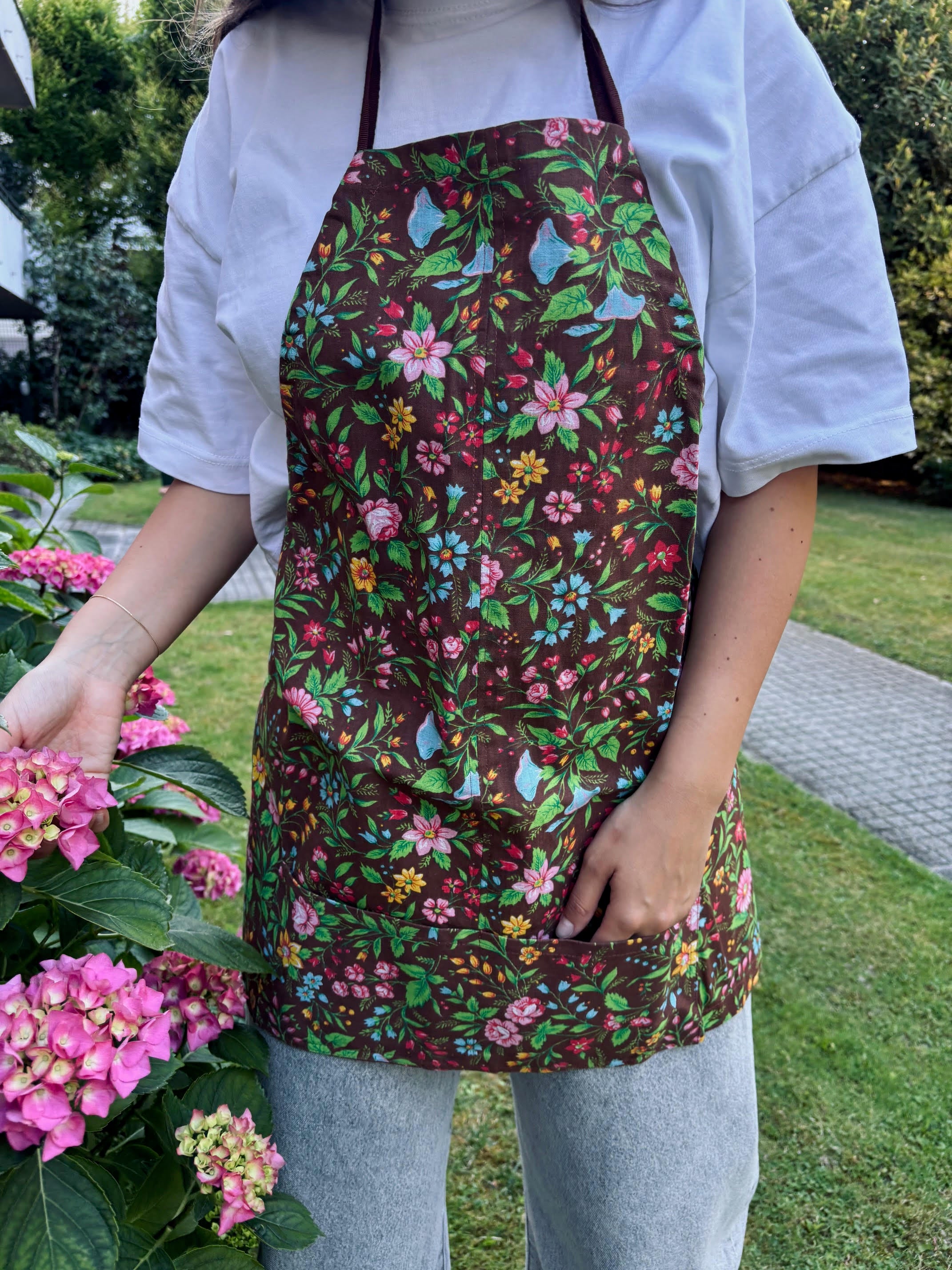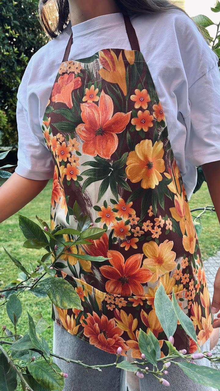 Grembiule da giardinaggio “ jardin” realizzati con tela per esterno vintage a fiori (due varianti: fiori grandi e fiori piccoli)