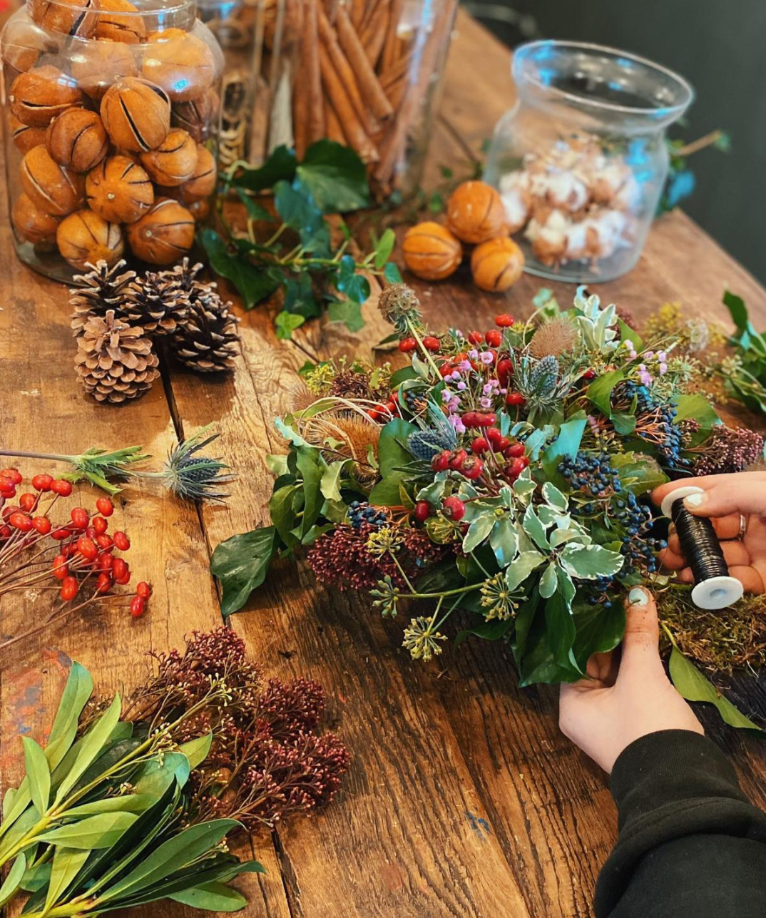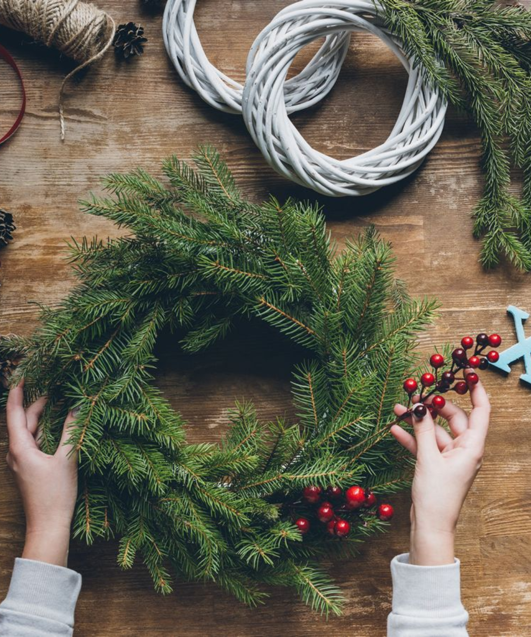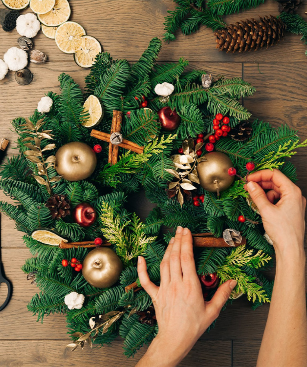 Laboratorio per creare e decorare la ghirlanda natalizia con materiali naturali, fiori essiccati, bacche e altri elementi vegetale.