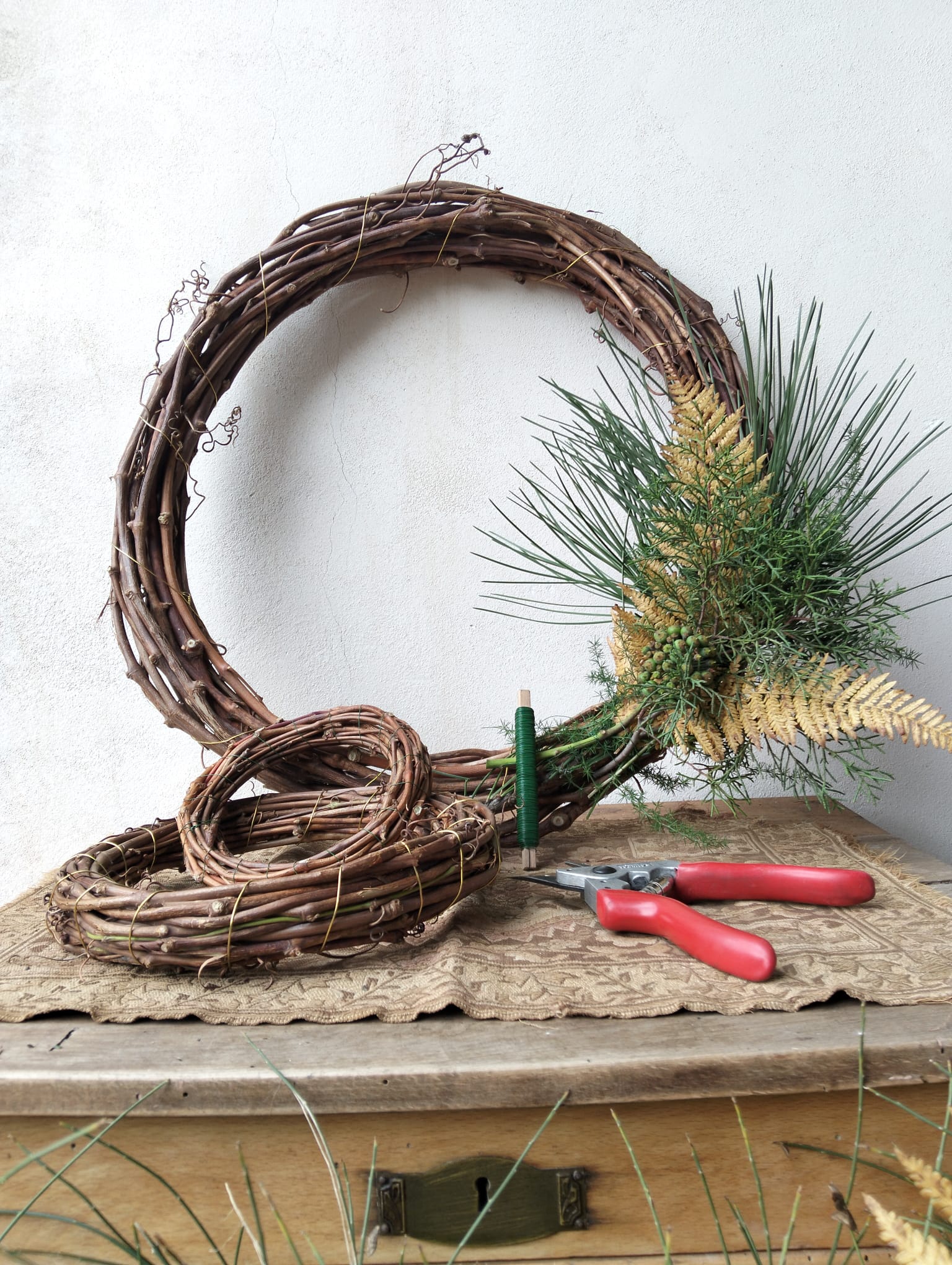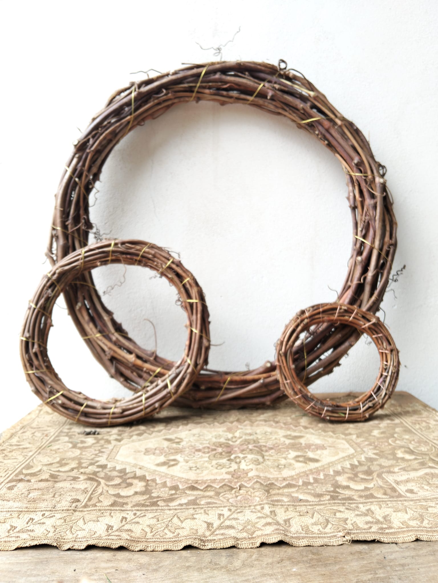 Base ghirlanda in vite americana intrecciata a mano con materiali naturali.