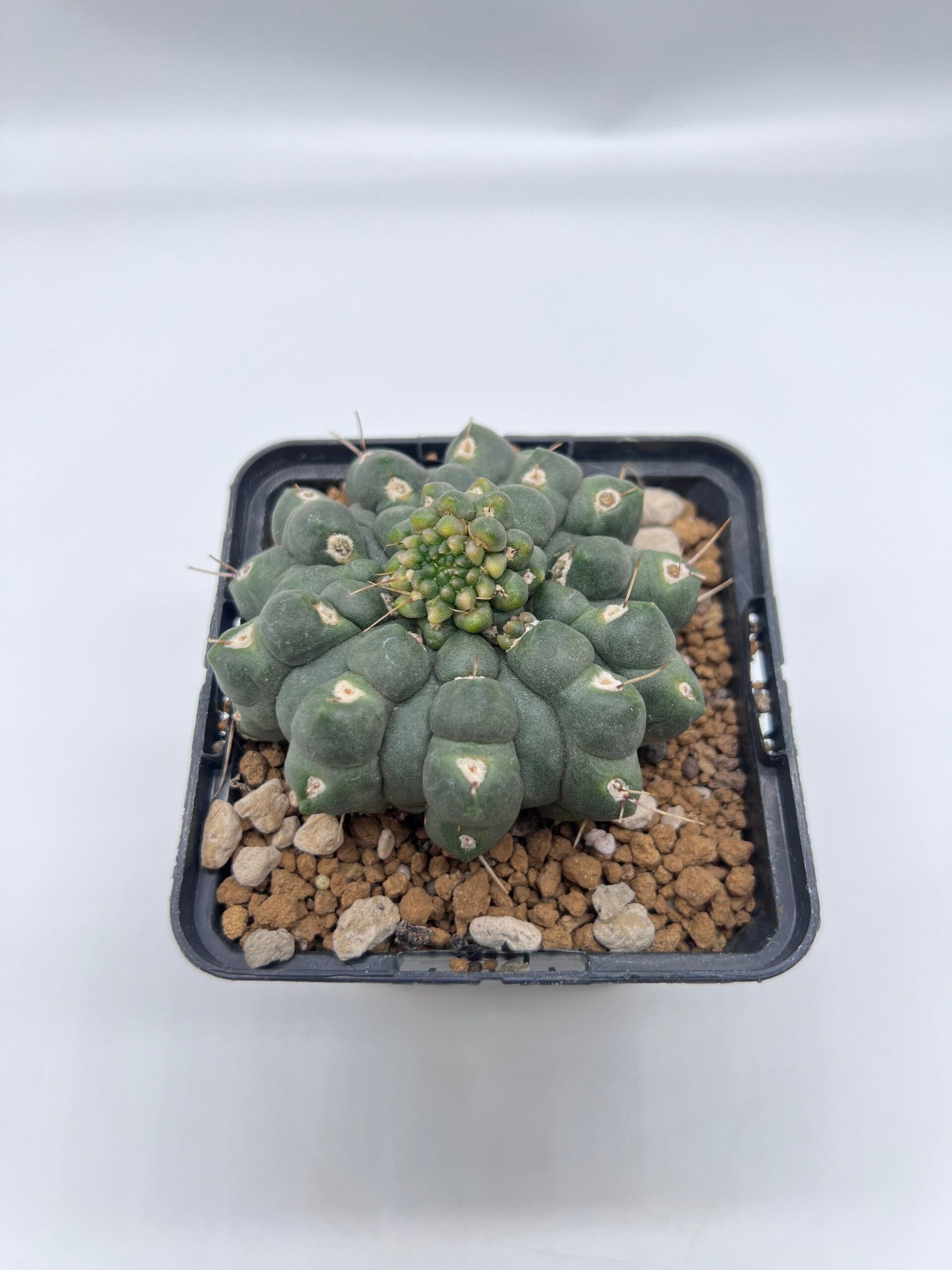 La forma mostruosa di questa cactacea presenta anomalie geometriche, ad esempio talvolta protuberanze asimmetriche o assenza di spine, differenti per ogni singolo esemplare, tanto da rendere ognuno di essi assolutamente unico e per questo estremamente ricercato dai collezionisti. Nella sua forma normale si tratta di una piccola cactacea dalla forma globosa, a crescita lenta e depressa all’apice, che presenta costolature ben definite il cui colore può variare tra il verde oliva e il grigio scuro opaco. E’ munita di spine dritte di un deciso bianco-giallastro, di lunghezza variabile e che talvolta tendono ad incurvarsi verso l’alto. All’apice del fusto sbocciano meravigliose infiorescenze imbutiformi, piuttosto grandi e di una colorazione bianca, talmente lucida da sembrare seta.