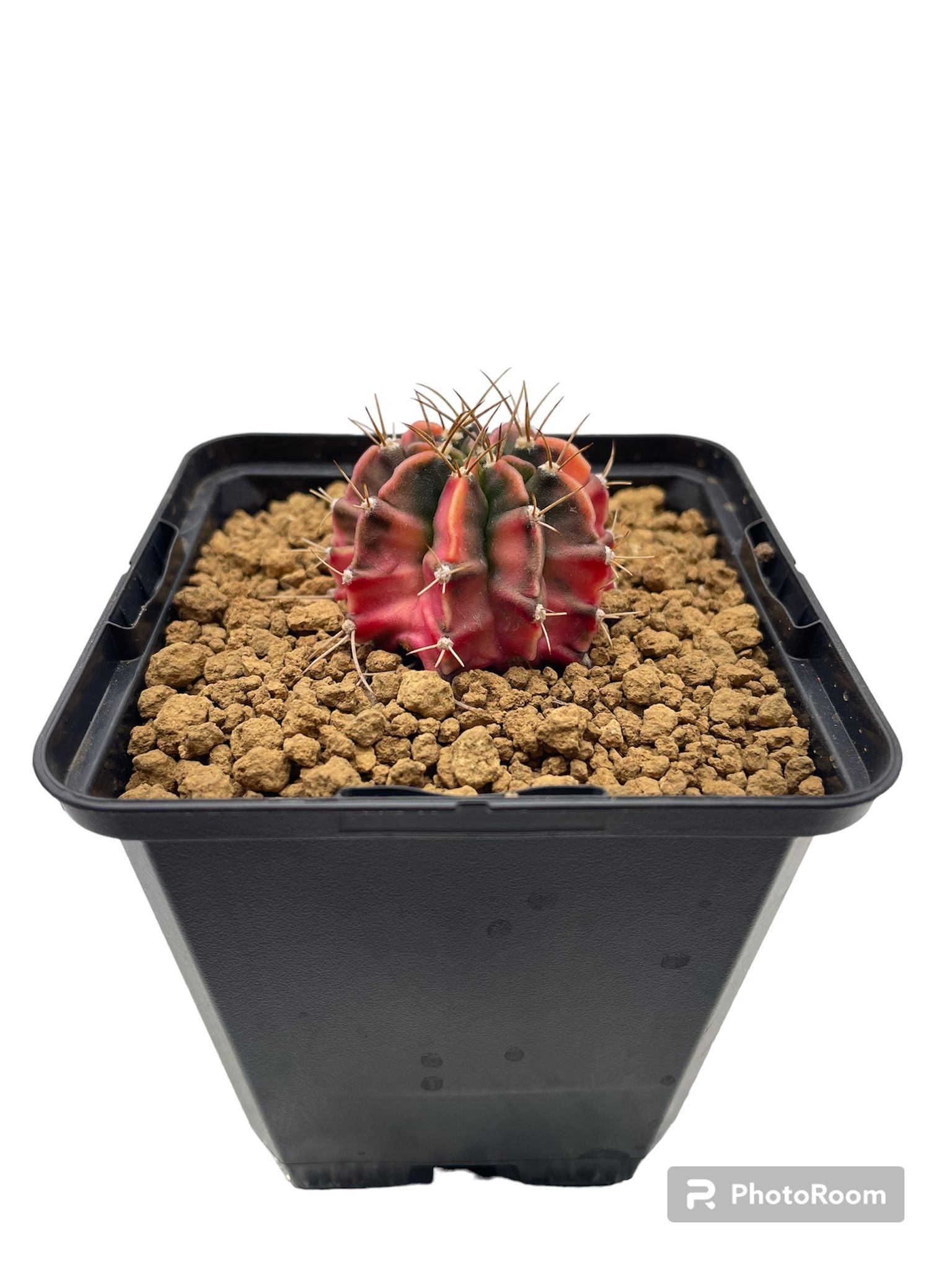 Gymnocalycium Mihanovichii Variegata è un piccolo cactus originario del Paraguay dal portamento globoso che tende ad accestirsi alla base. Sul fusto di questo genere di piante sono presenti delle costolature ben marcate da scanalature ben marcate dalla quale fuoriescono delle spine corte. La grande particolarità di questa pianta è il colore che il suo stelo può assumere, con  colorazioni che vanno dal rosso, come in questo caso, al verde, o dal marrone al verde scuro. Possono anche sfoggiare delle incredibili variegature gialle e rosa che saranno uniche per ciascun esemplare. La fioritura avviene in primavera, generando dei fiori di colore verde-giallo dall’aspetto delicato.