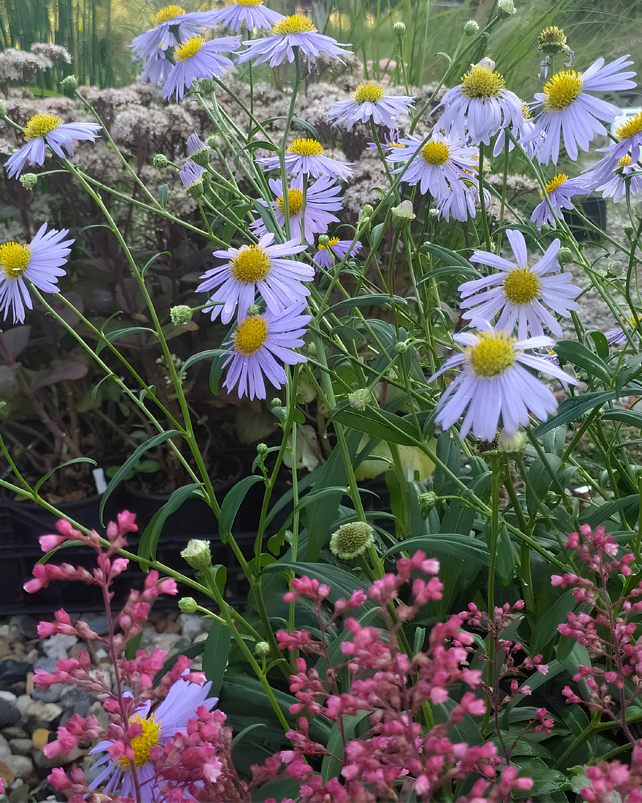 L’Aster (Miyamayomena) koraiensis è una pianta erbacea perenne vigorosa e tappezzante, ideale per creare macchie compatte di verde intenso e lunghe fioriture estive. Forma cespi densi di foglie larghe e decorative da cui emergono grandi fiori azzurri semplici, luminosi e molto ornamentali, capaci di ravvivare bordure e aiuole da luglio fino all’inizio dell’autunno.