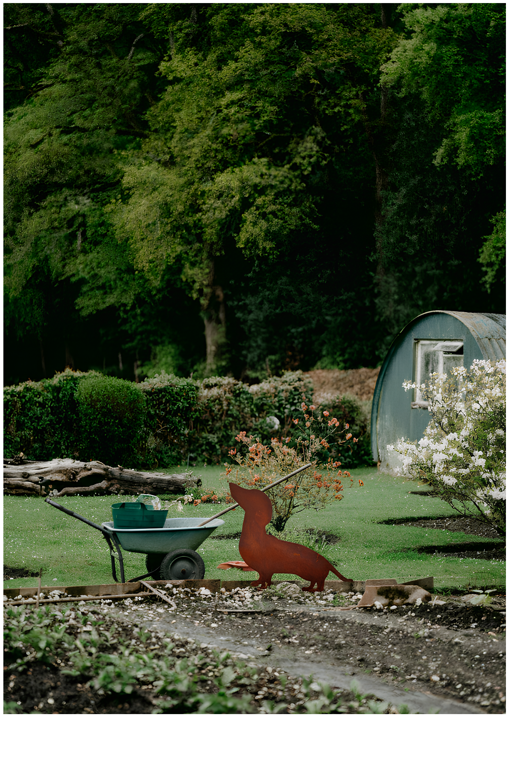 Bassottino in acciaio Corten realizzato a mano, alto 27 cm e dotato di base coordinata. Un elegante complemento d’arredo per interni ed esterni, ideale per giardini, terrazzi o ambienti domestici.