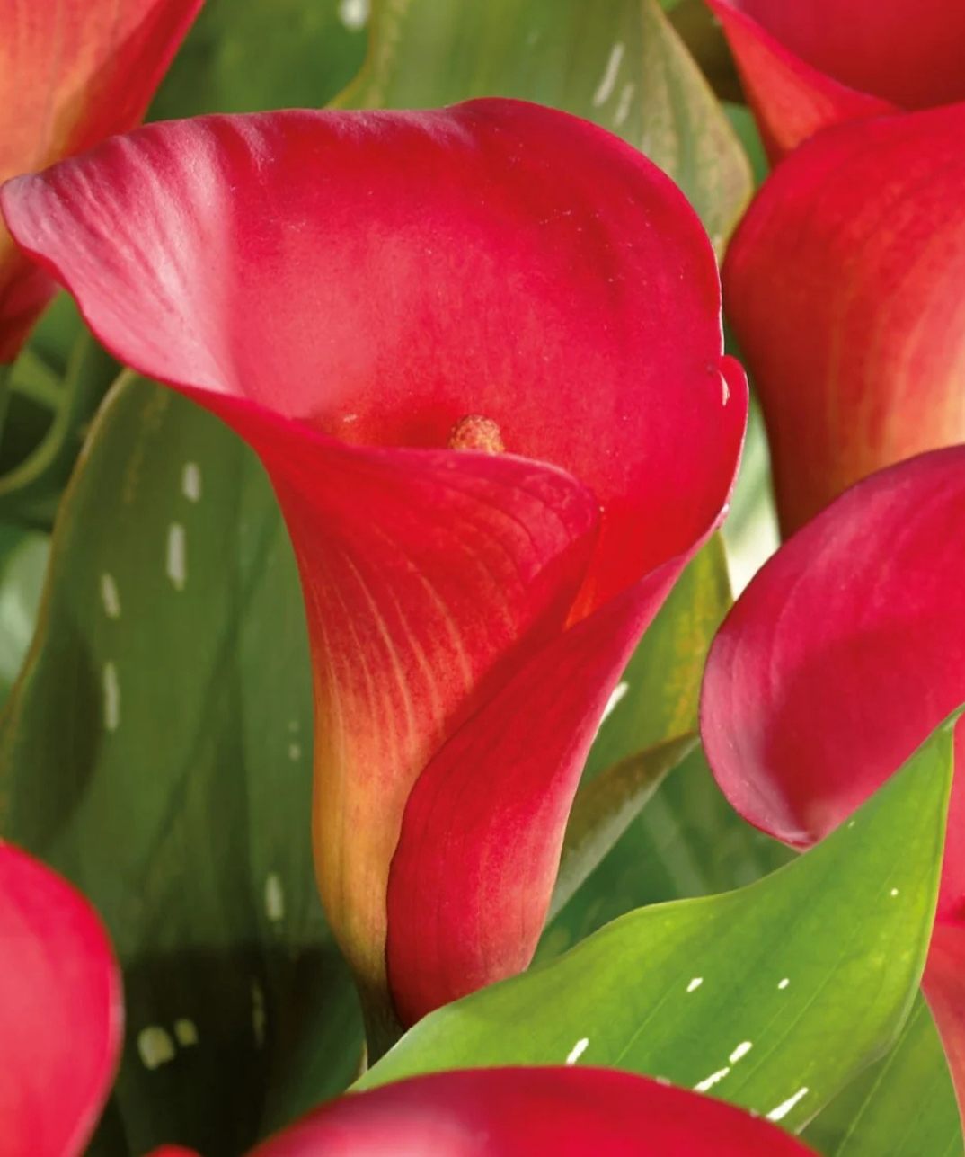 Affascinante pianta rizomatosa perenne, nota per i suoi fiori rossi intensi e le foglie verdi screziate di bianco, perfetta per bordure, aiuole o vasi sia all’aperto che in interno.