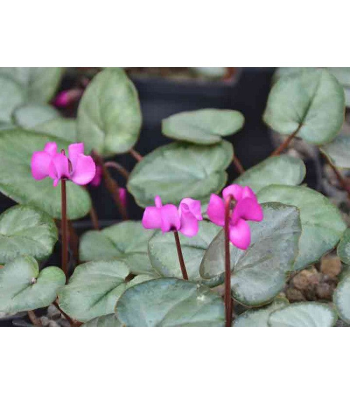 Fiori eleganti di colore rosa chiaro, emergono direttamente dal fogliame argentato creando un contrasto molto decorativo.