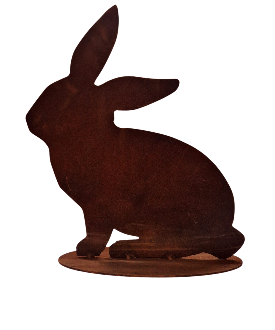 Coniglio in acciaio Corten, realizzato a mano ha un'altezza di 37 cm, realizzato su base sempre in Corten, può essere appoggiato oppure utilizzato come oggetto d'arredo sia da interno che da esterno.