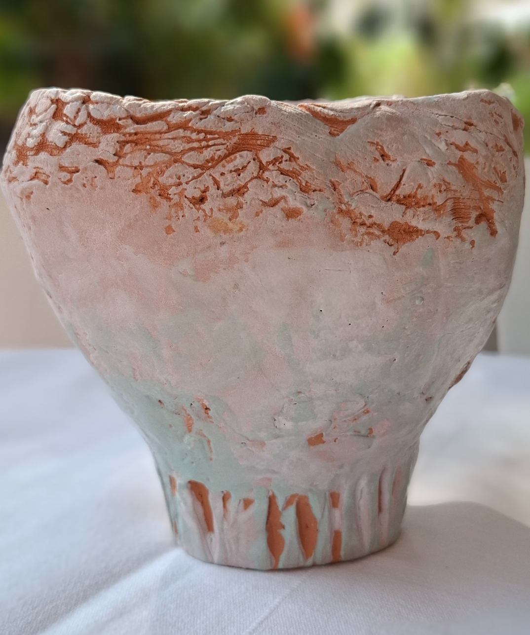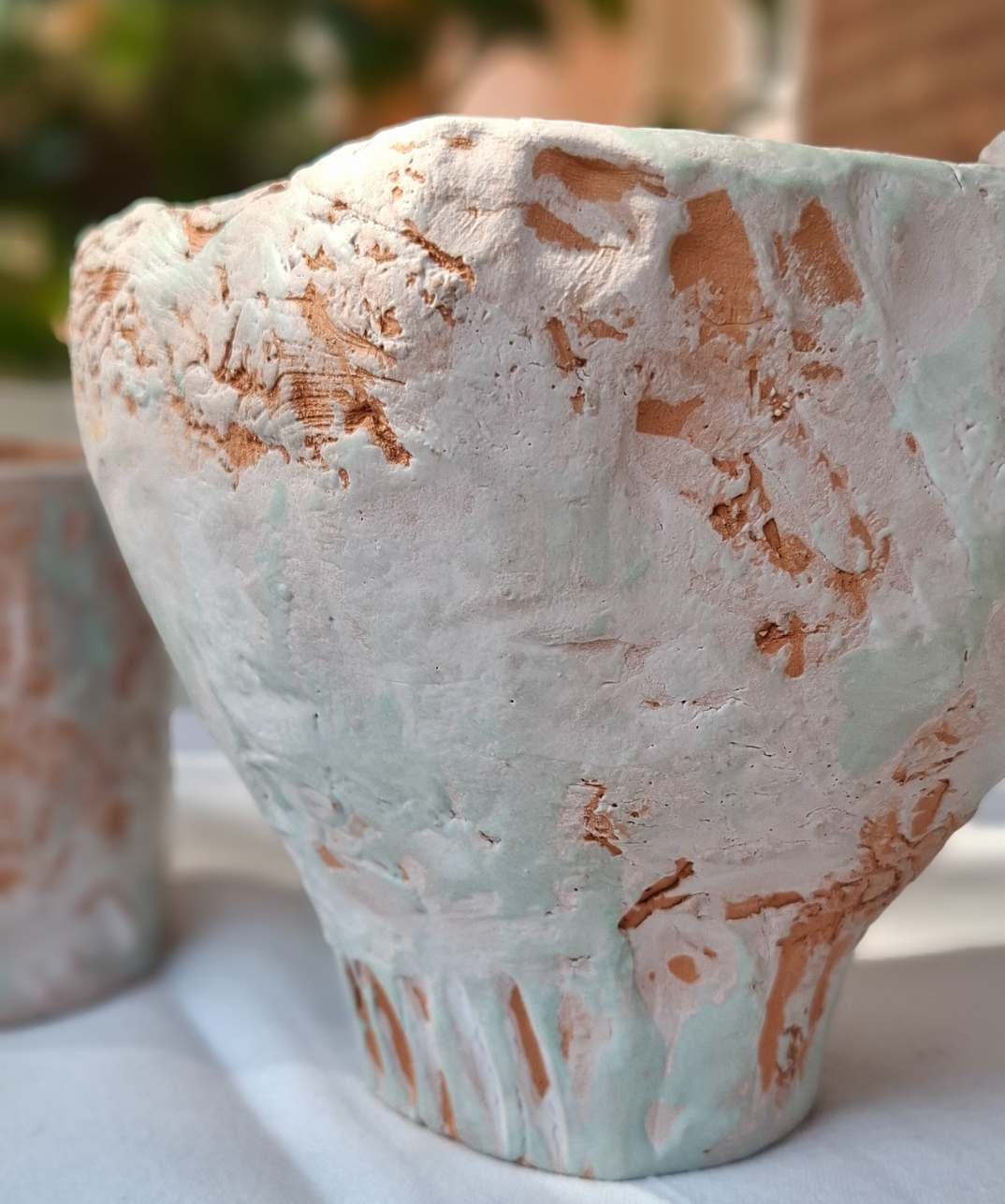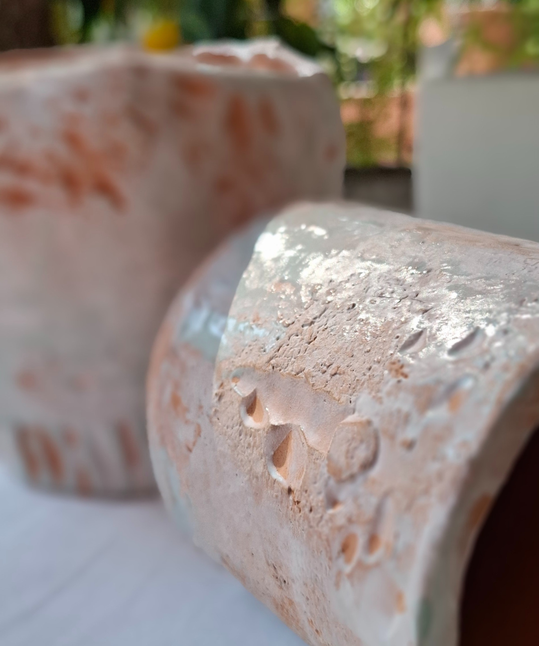 Due vasi artigianali in ceramica, realizzati interamente a mano e caratterizzati da una texture a rilievo nei toni del marrone, bianco e verde acqua. Ogni imperfezione racconta la manualità e l’unicità della lavorazione artigianale.