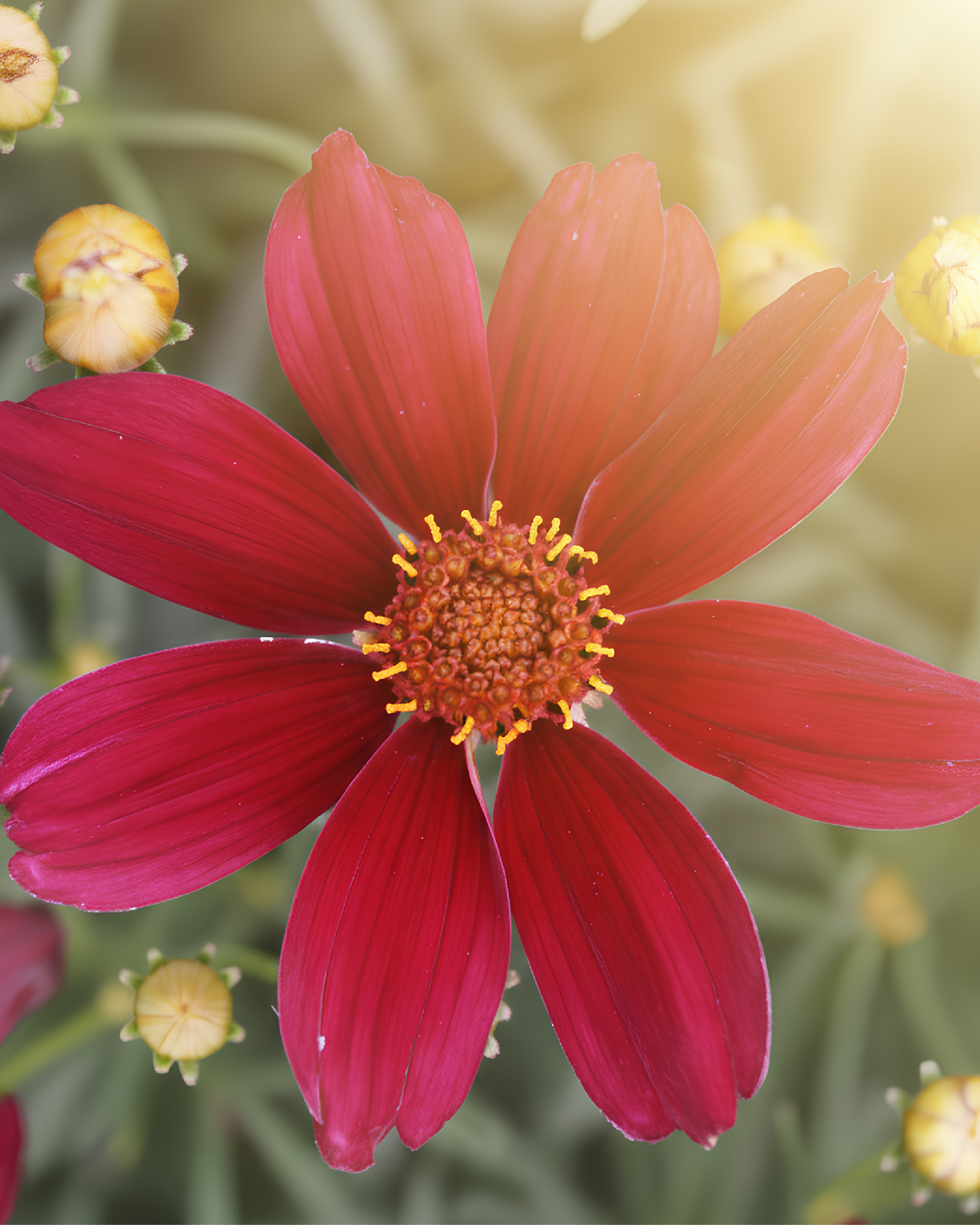 La Coreopsis ‘Red Satin’ è una perenne compatta e fiorifera, ideale per aiuole soleggiate e bordure colorate. Il fogliame verde brillante e frastagliato sostiene fiori vivaci dal colore rosso vino intenso con centro giallo ambrato, che illuminano il giardino dall’inizio dell’estate fino a ottobre. Perfetta per creare contrasti cromatici e aggiungere dinamismo a composizioni miste e vasi decorativi.