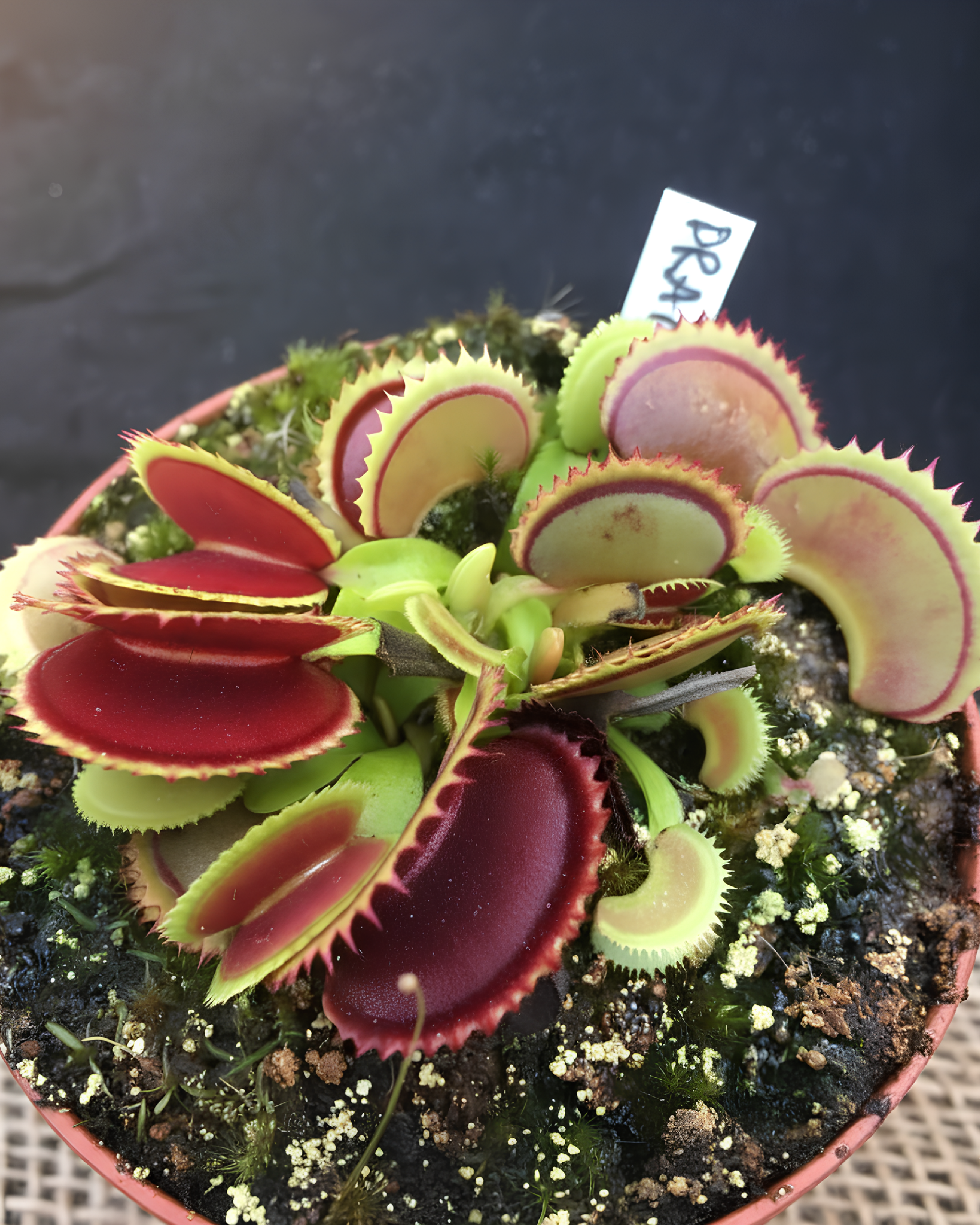 La Dionaea muscipula ‘Dracula’ è una cultivar di Venere acchiappamosche dal forte impatto estetico, caratterizzata da trappole scure e dalla forma insolita. I margini interni risultano fusi e privi delle classiche ciglia lunghe, creando una “bocca” più arrotondata e compatta, dall’aspetto quasi privo di denti. L’intensa colorazione rosso-violacea delle trappole, accentuata dall’esposizione al sole diretto, rende questa varietà particolarmente affascinante e ricercata tra gli appassionati di piante carnivore.