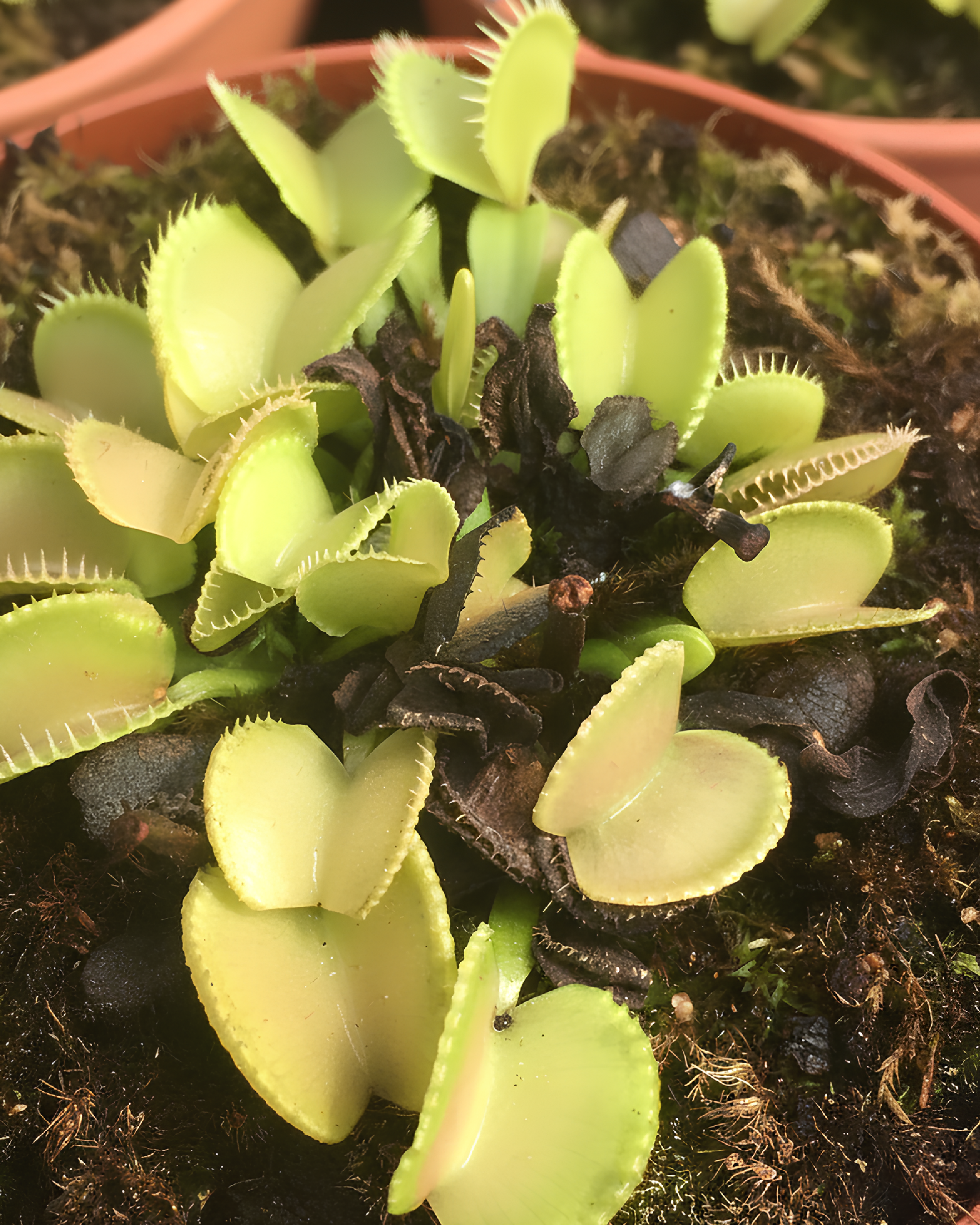 La Dionaea muscipula ‘Green Wizard’, conosciuta anche come Venere acchiappamosche verde, è una cultivar apprezzata per la sua colorazione interamente verde, anche sotto intensa esposizione solare, e per la sua dentatura corta e rada. Le trappole di dimensioni medie sono ben formate e perfettamente funzionali, capaci di chiudersi rapidamente per catturare piccoli insetti, rendendo questa varietà ideale per chi cerca un aspetto più “classico” o un contrasto cromatico all’interno di una collezione di piante carnivore.