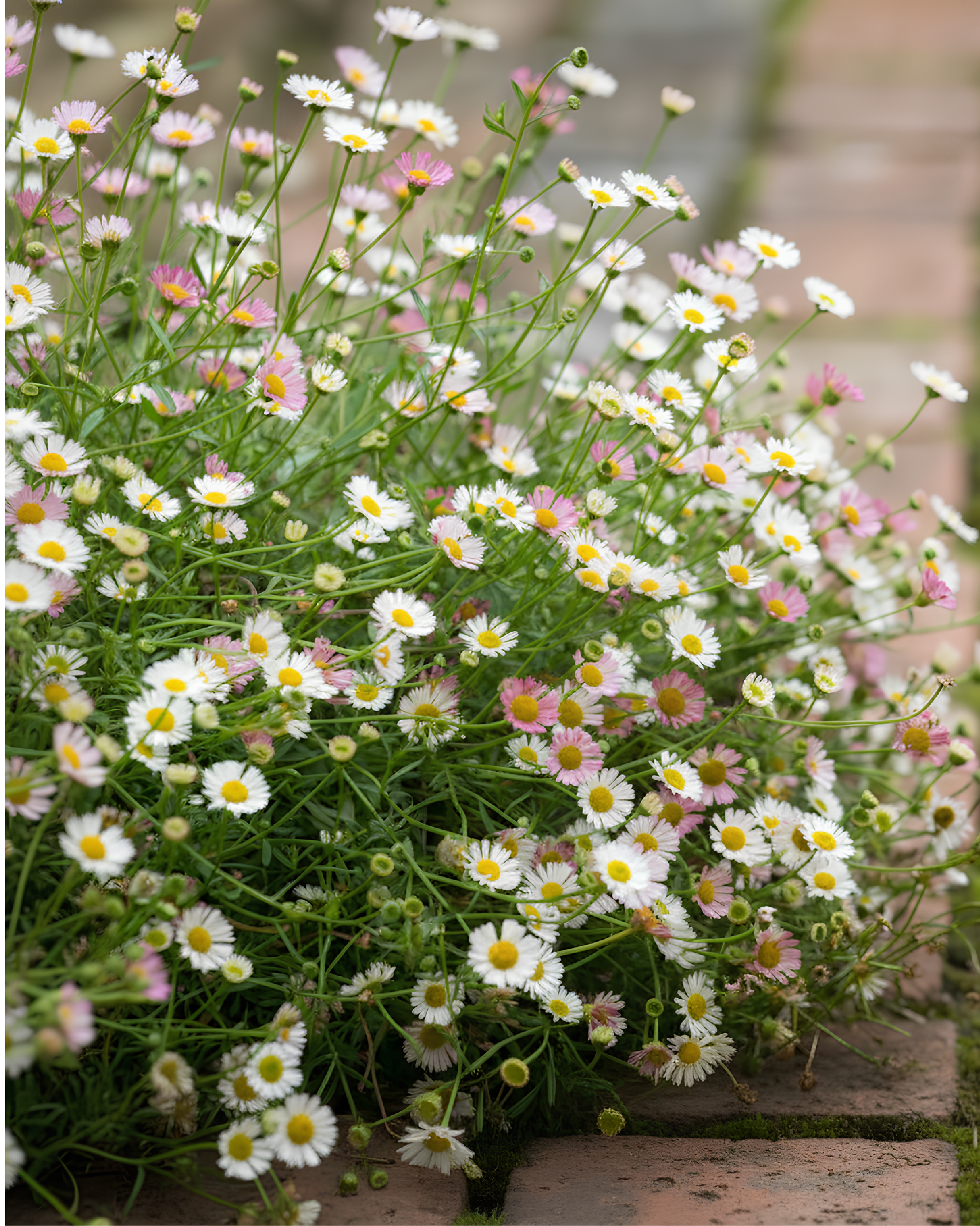 Estremamente vigorosa ed “esuberante”, si adatta facilmente a sole o mezz’ombra e tollera bene caldo e siccità. Da maggio a novembre si ricopre di una nuvola di piccole margherite che sbocciano bianche e sfumano delicatamente al rosa, regalando un effetto romantico e spontaneo, perfetto per giardini informali e mediterranei.