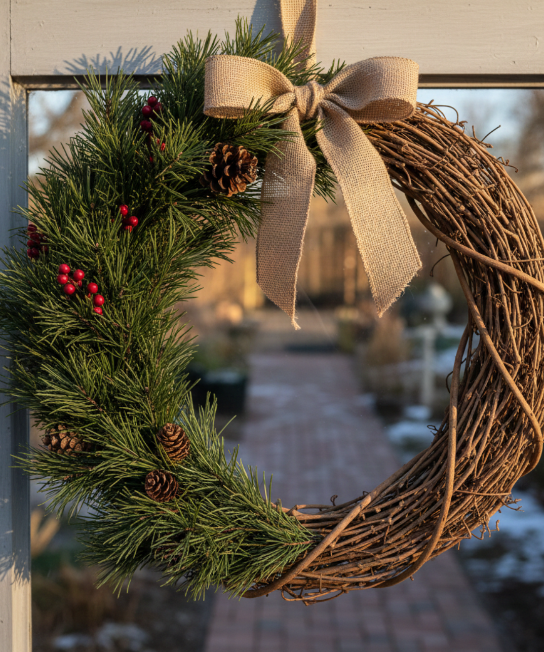 Porta nella tua casa la magia autentica del Natale con questa elegante ghirlanda in vite intrecciata, impreziosita da una ricca mezza decorazione realizzata con rami di pino Nobilis, bacche rosse e piccole pigne naturali.