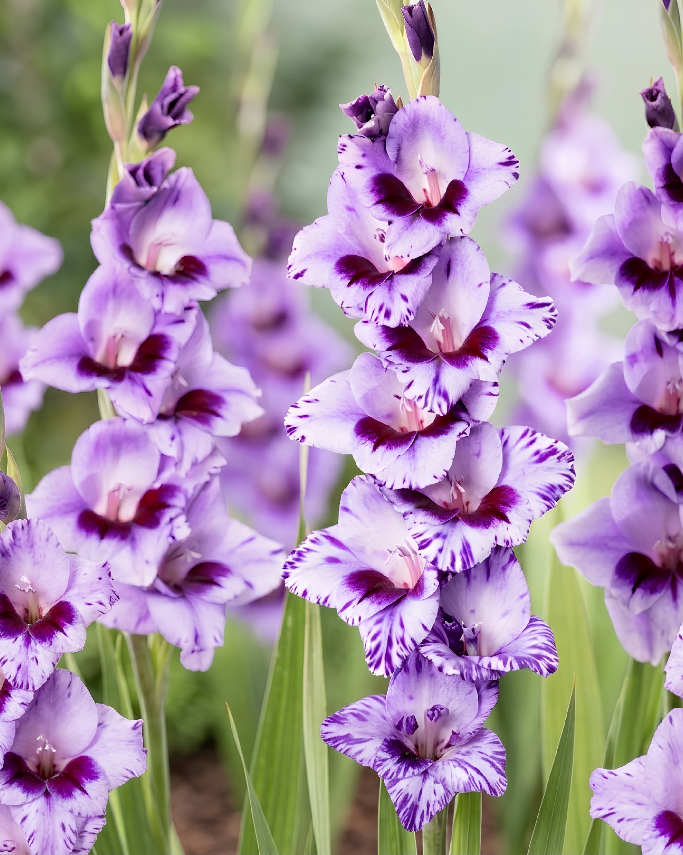 Fiori grandi di colore blu brillante, disposti su spighe lunghe 60–70 cm