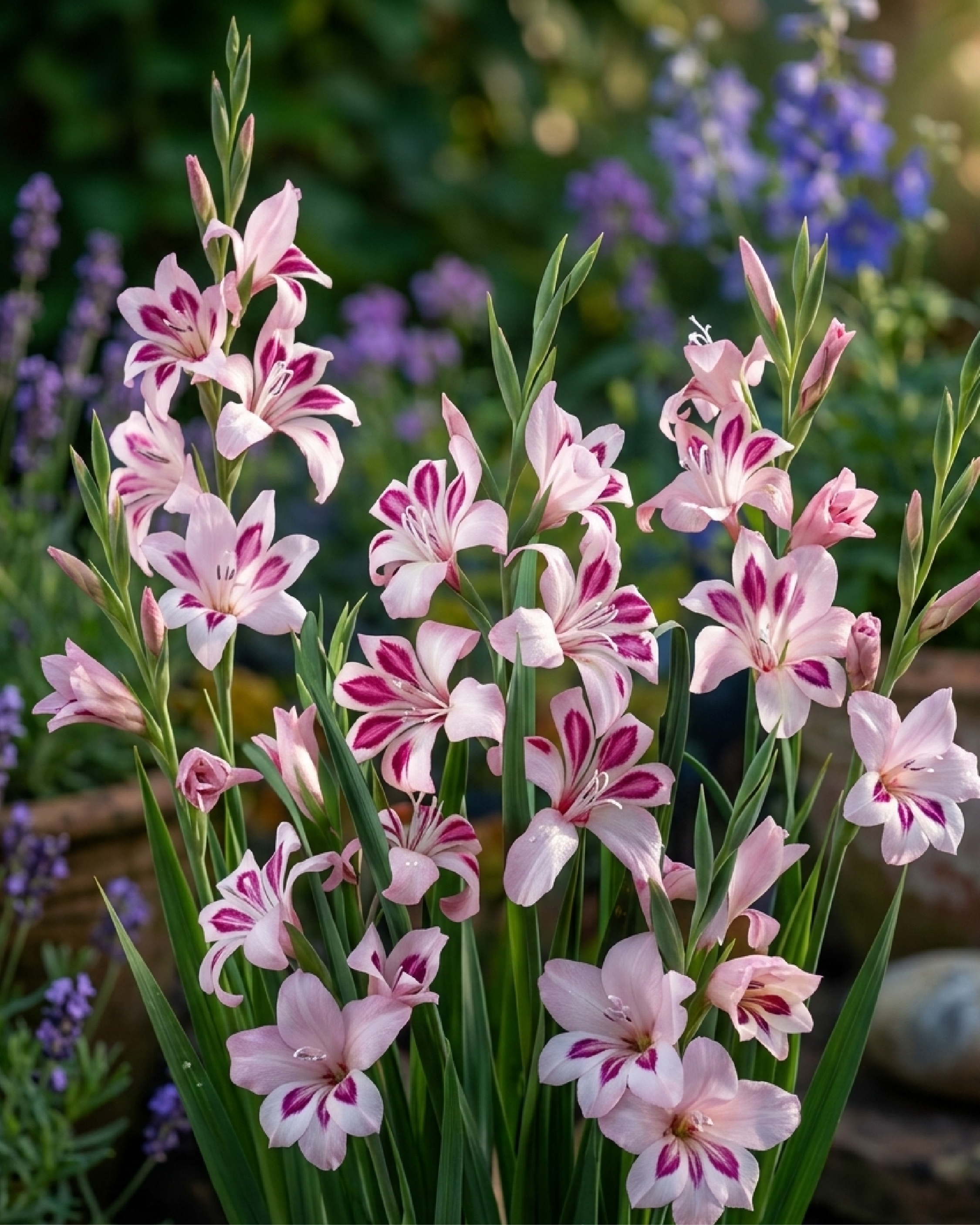 Fiori piccoli di colore intenso, disposti su spighe corte lunghe circa 40–50 cm