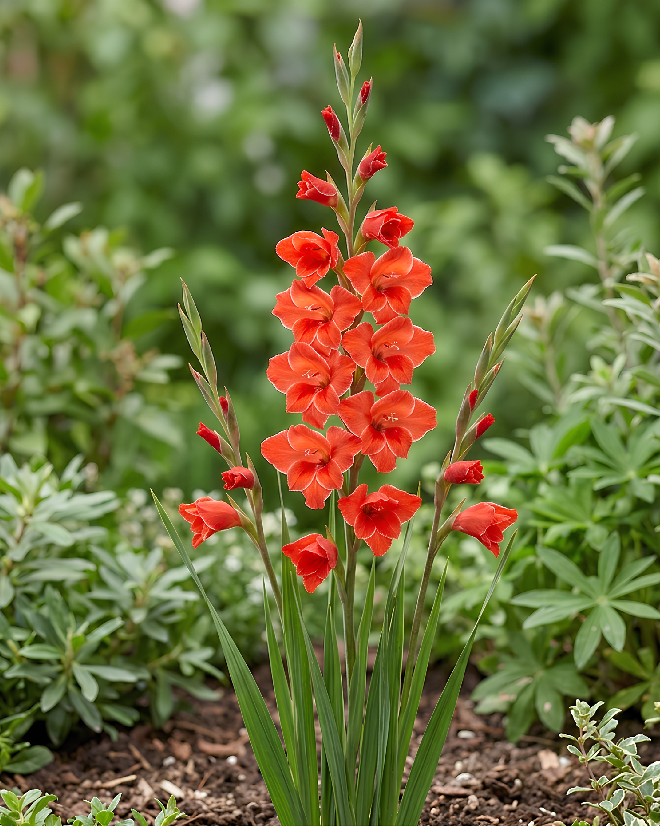 Perenne bulbosa ornamentale con spighe compatte e fiori luminosi, ideale per bordure, aiuole e vasche in giardini soleggiati.