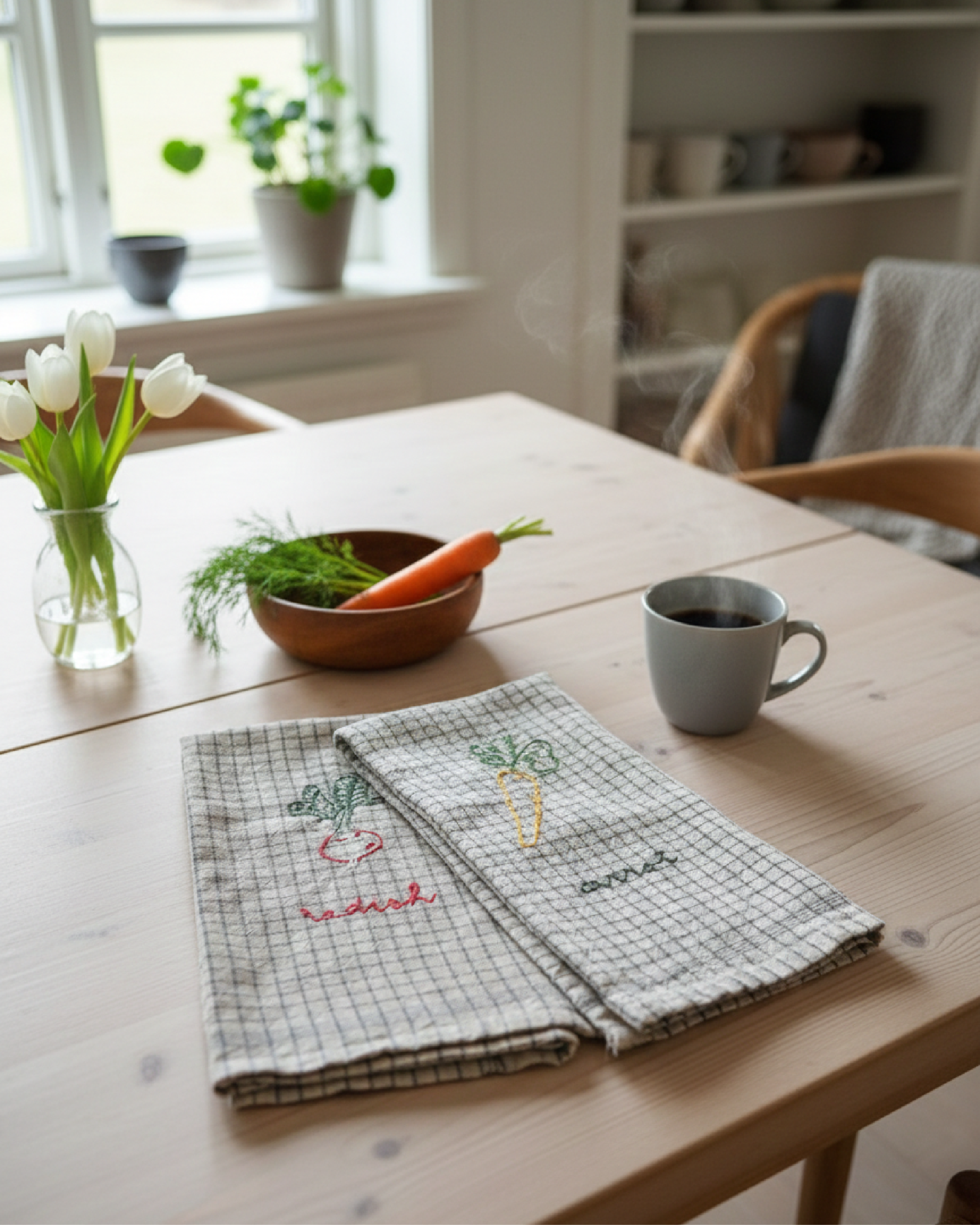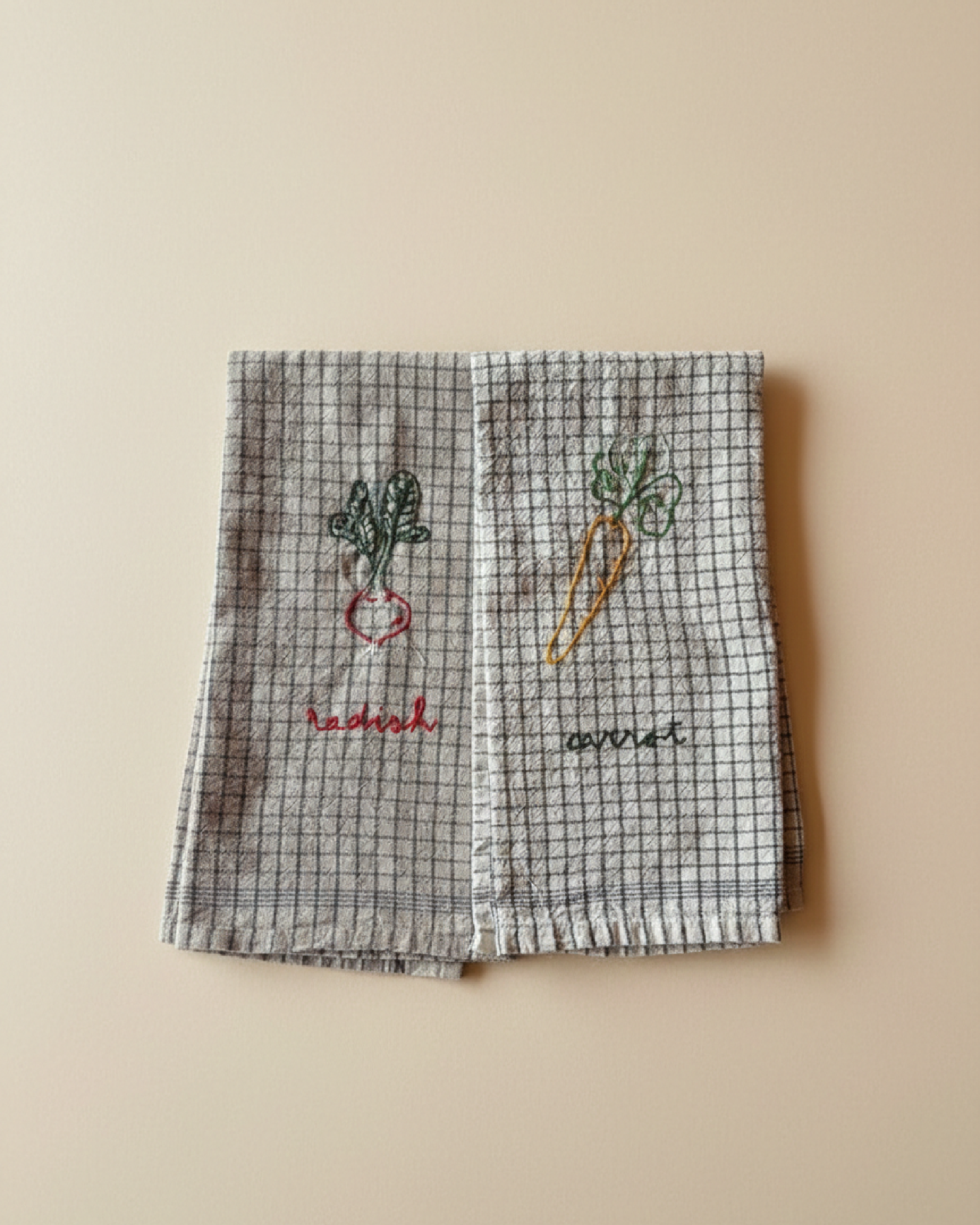Strofinacci da cucina artigianali con ricamo a mano a tema ortaggi, pensati per portare in cucina un tocco naturale, poetico e senza tempo. Le delicate illustrazioni tessili di carota e ravanello trasformano un semplice accessorio quotidiano in un piccolo elemento decorativo, capace di arricchire la tavola e gli spazi con calore e personalità.