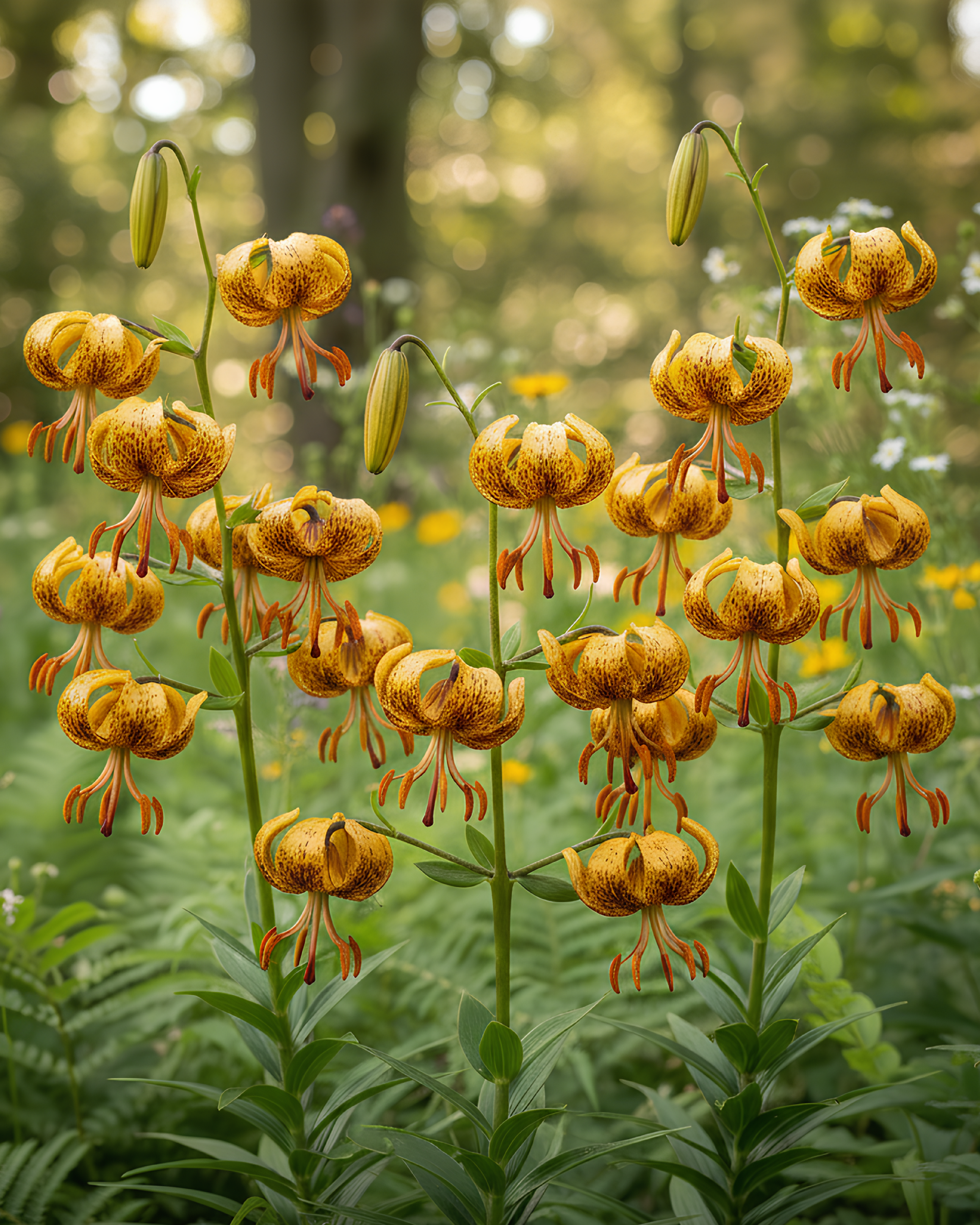 Giglio perenne montano, petali ricurvi all’indietro, colori vari dal giallo al rosso. Adatto a naturalizzazione, resistente.