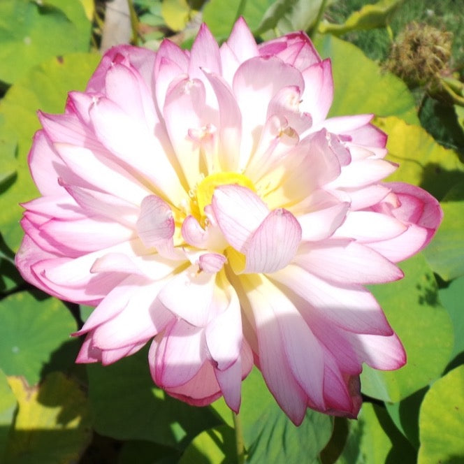 Questo Nelumbo Lu Shan Ban Lian presenta un fiore doppio bianco rosato che lo rende un'aggiunta elegante per il tuo giardino. Grazie alla sua fioritura rigogliosa e alle sue grandi dimensioni, è sicuramente una scelta perfetta per chi ama le piante fiorite e decorative.