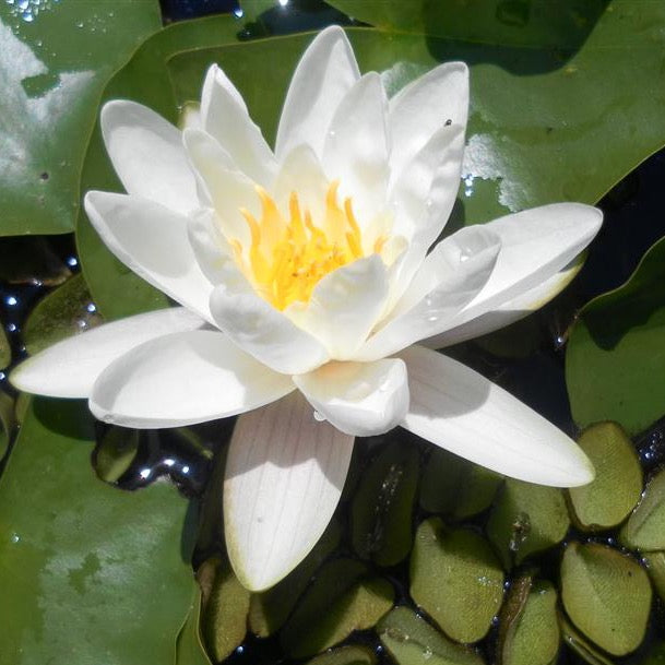 Questa ninfea rustica, nota come Ninfea Candidissima, è caratterizzata da semplici fiori bianco puro a coppa con un diametro di 10 cm, composti da 26-28 petali lanceolati. Le foglie verde oliva con macchie di porpora sono larghe 23-25 cm e hanno un picciolo verde. Resiste al gelo e fiorisce da marzo a settembre con petali delicati e profumati. Ibridata nel 1892, è un'antica varietà dall'inconfondibile fascino.