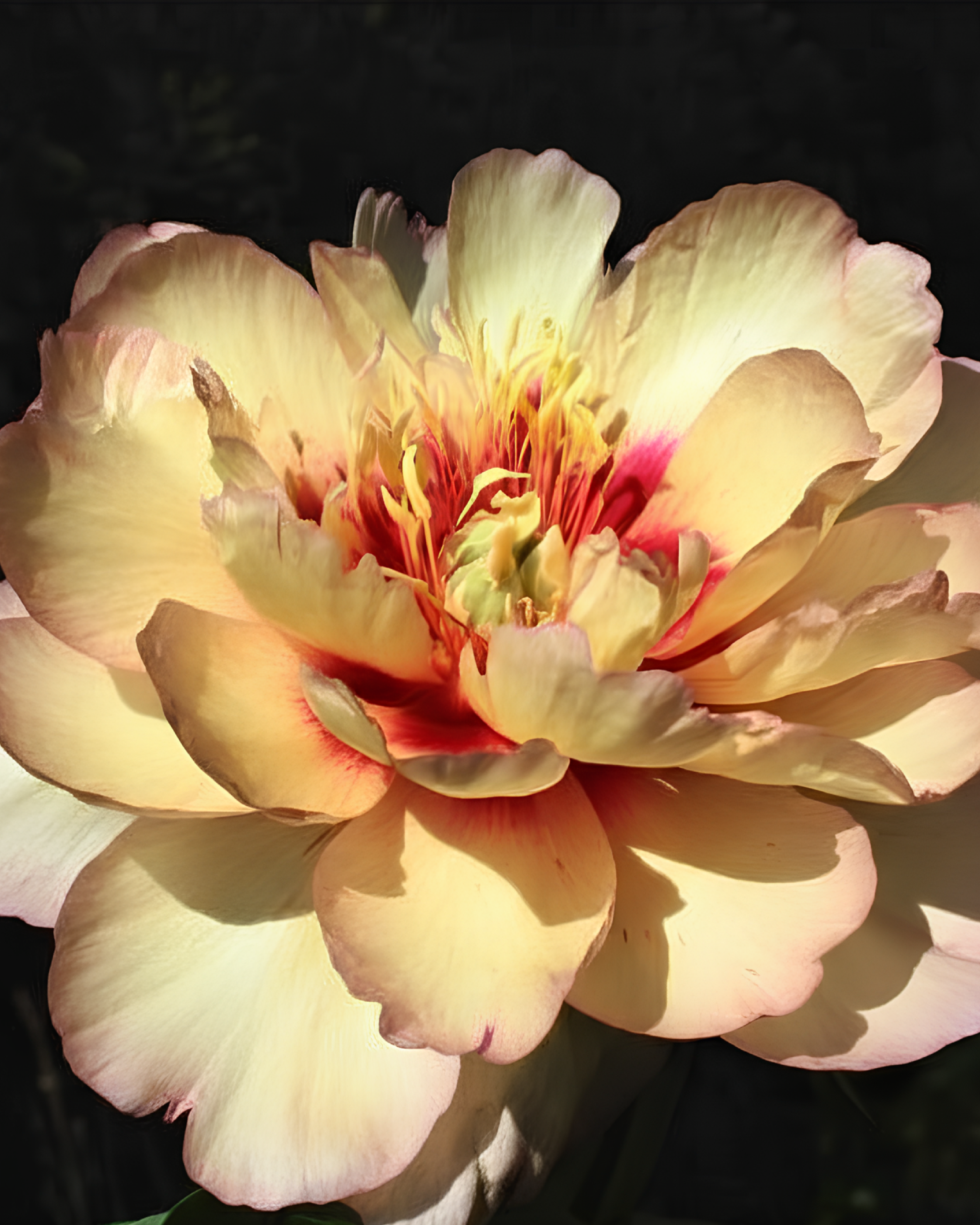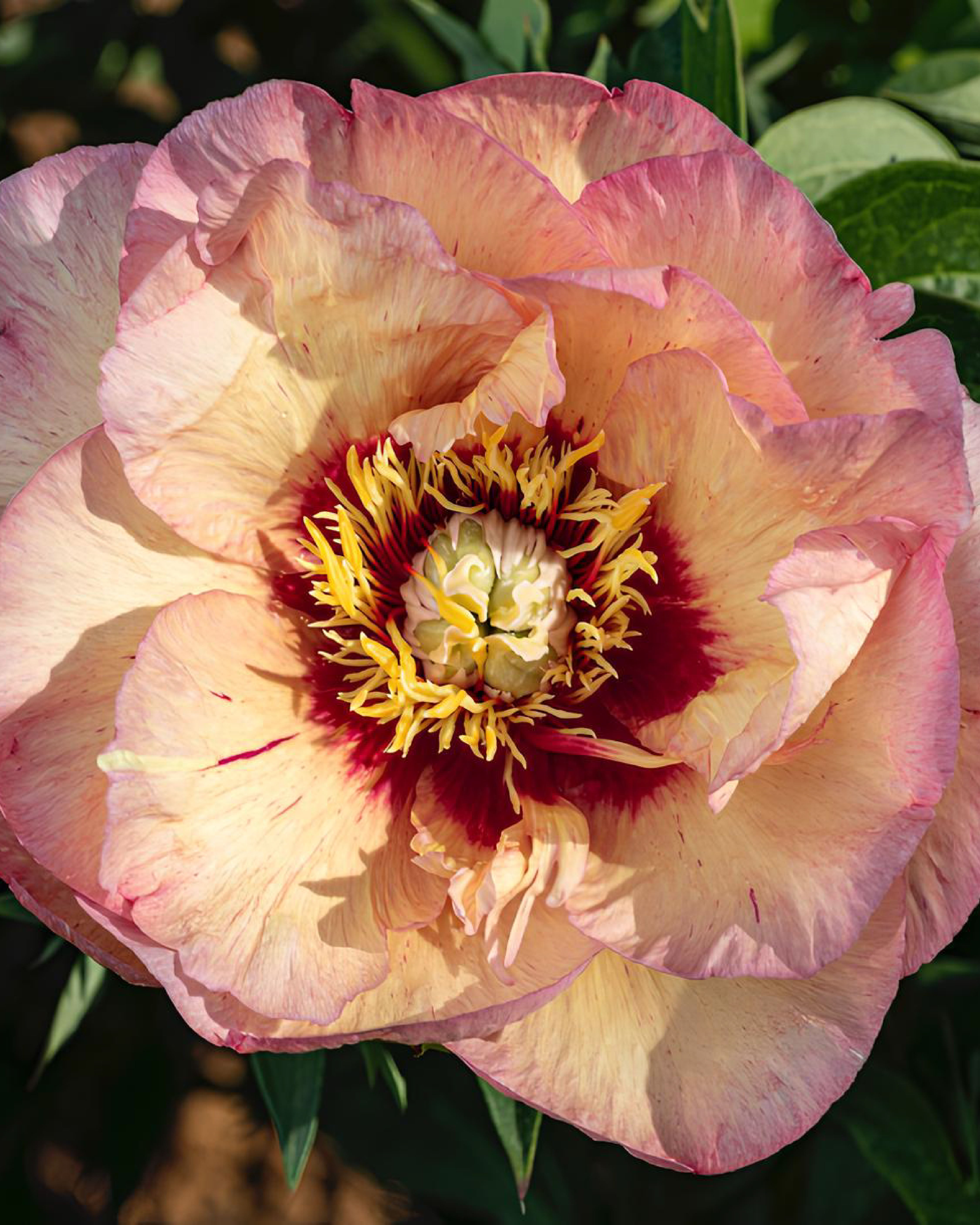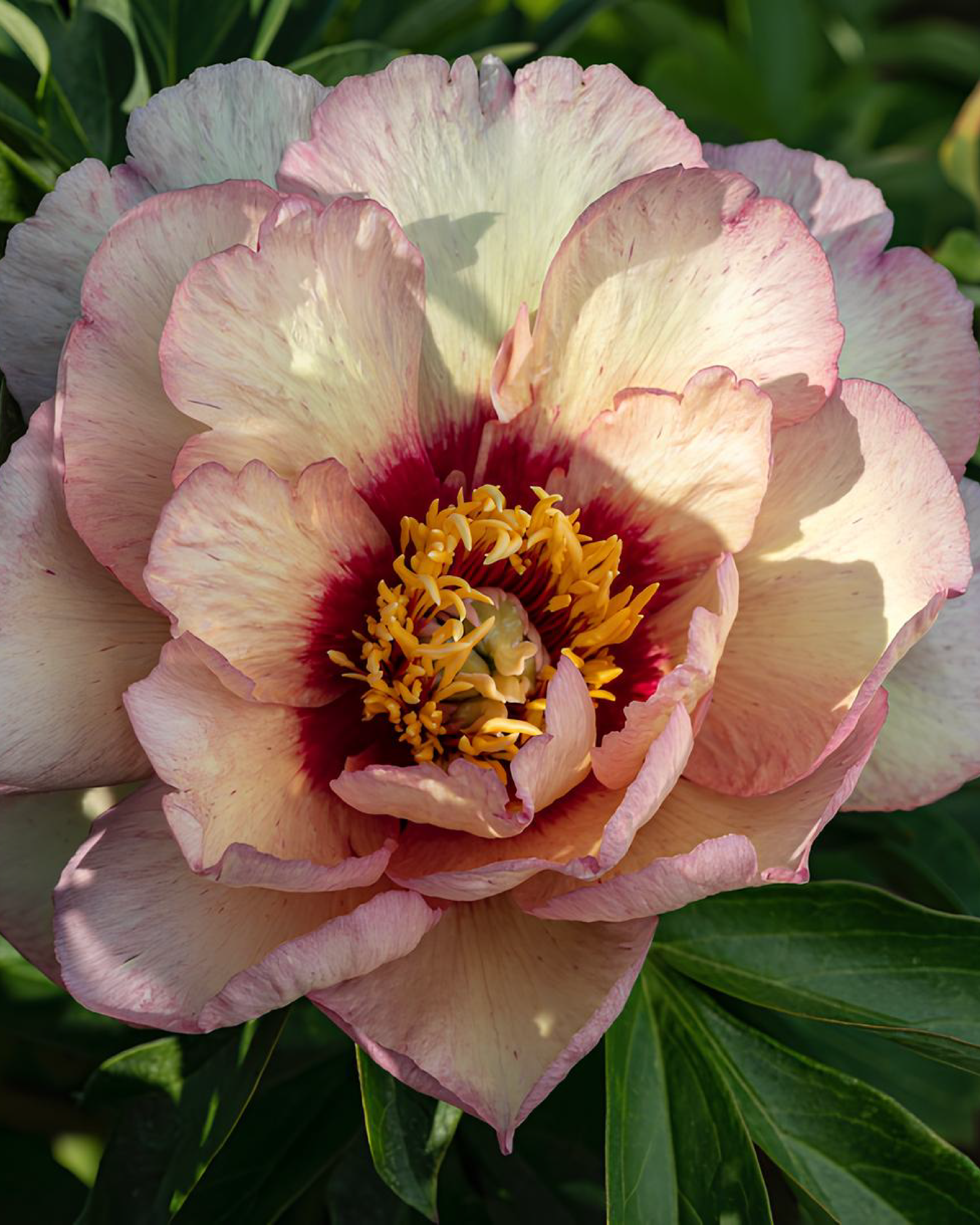 La Peonia ‘Callie’s Memory’ è un ibrido intersezionale Itoh che combina la resistenza della peonia erbacea con la fioritura spettacolare della peonia arbustiva. I suoi fiori grandi, semidoppi o doppi, mostrano una tavolozza di colori davvero unica: petali giallo crema con sfumature che vanno dal crema all’albicocca, bordi delicatamente screziati di rosa e un centro con gole bordeaux scuro quasi marrone.