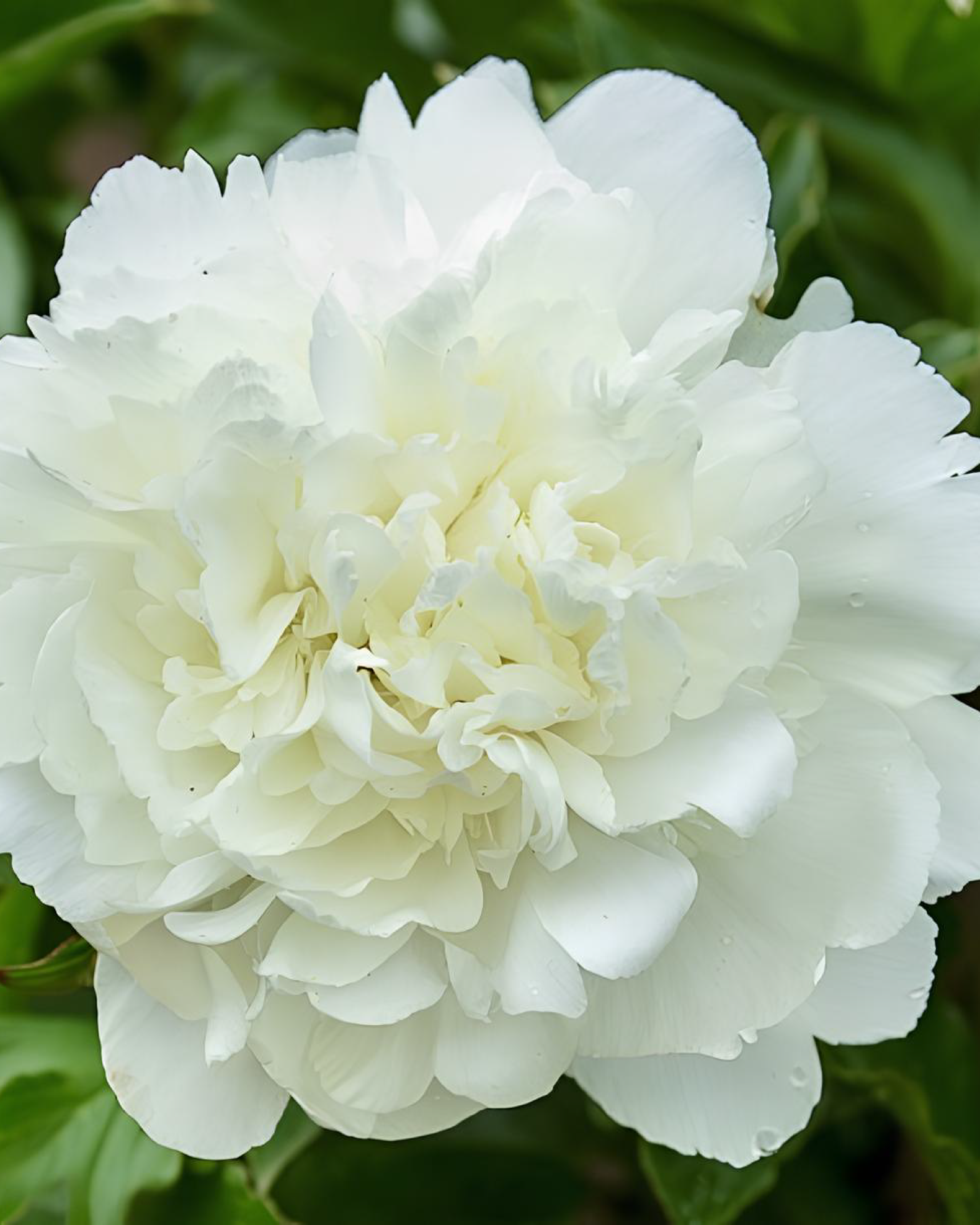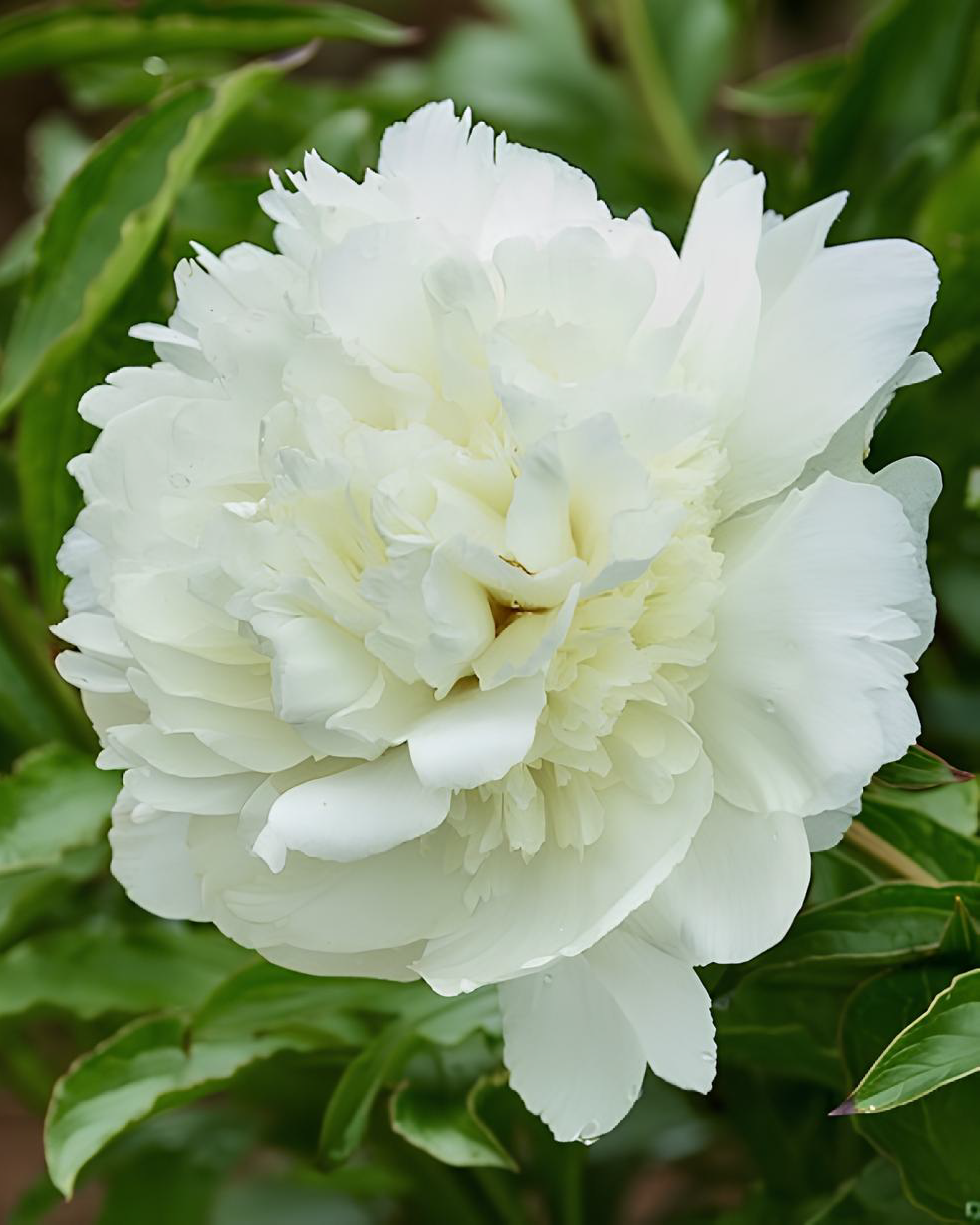 I fiori doppi, arruffati e leggermente piatti, raggiungono dimensioni importanti e si distinguono per il colore bianco puro, impreziosito da delicate striature rosse sui petali esterni e talvolta lungo i bordi di quelli centrali. L’effetto è elegante e raffinato, ideale per dare luminosità a bordure e aiuole. Il profumo ricco e avvolgente, simile a quello delle rose antiche, rende questa varietà particolarmente amata anche per bouquet e composizioni floreali.