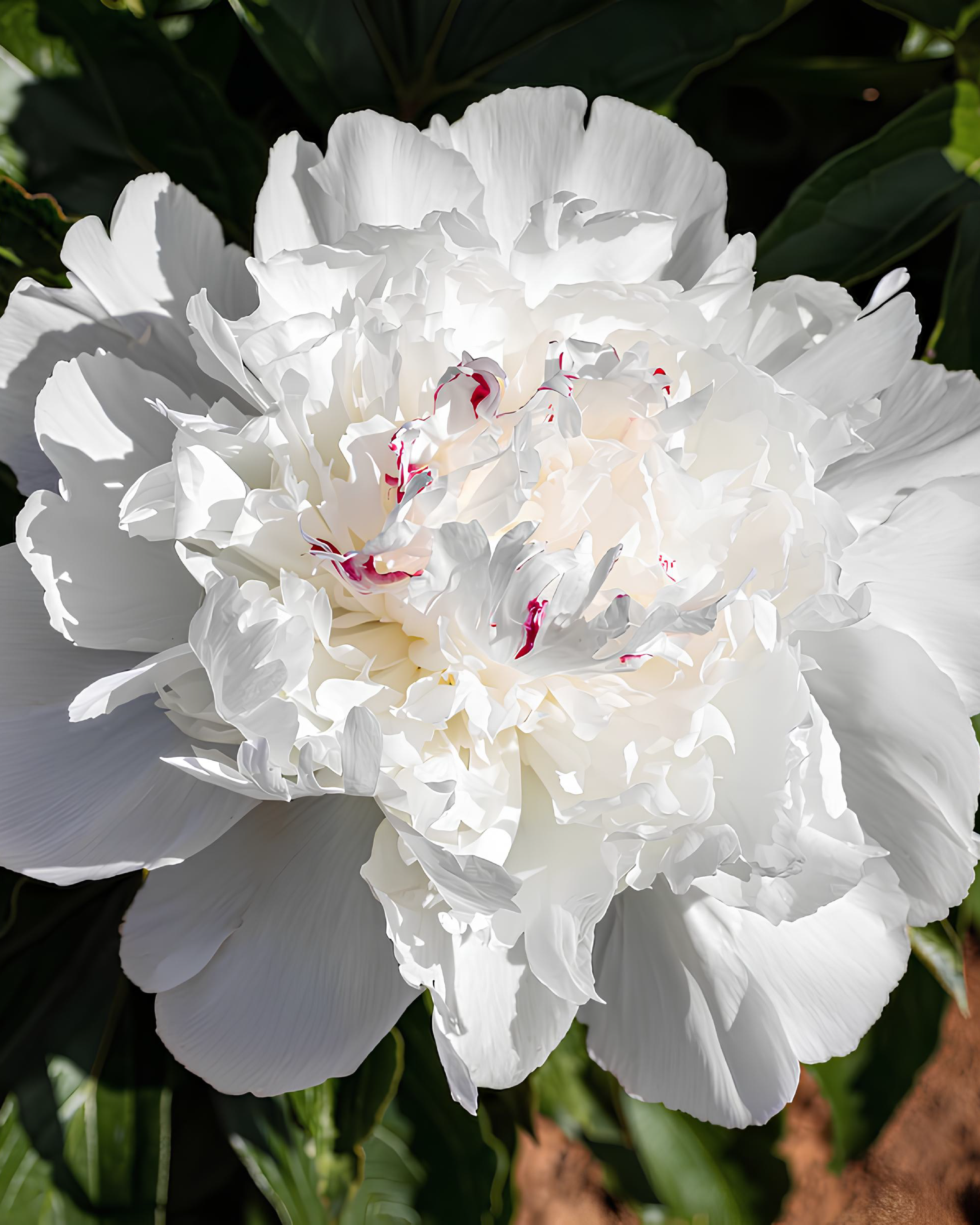 Doppio ad anemone, bianco con petaloidi centrali porpora