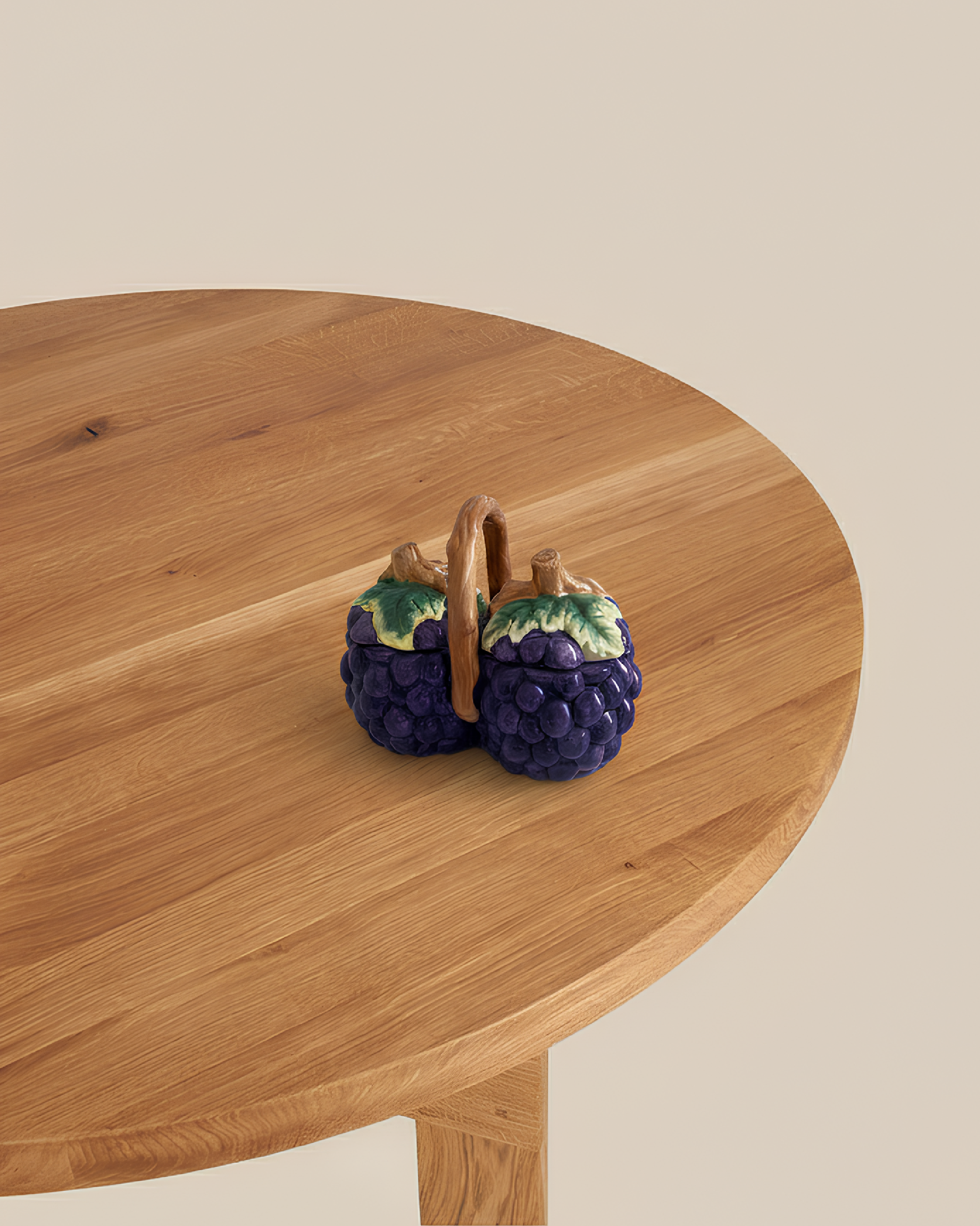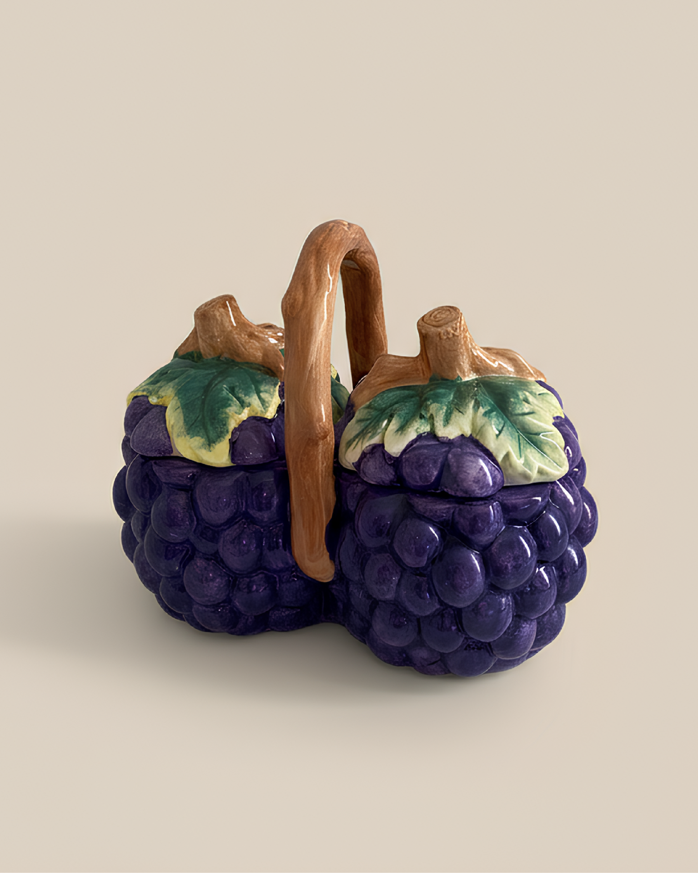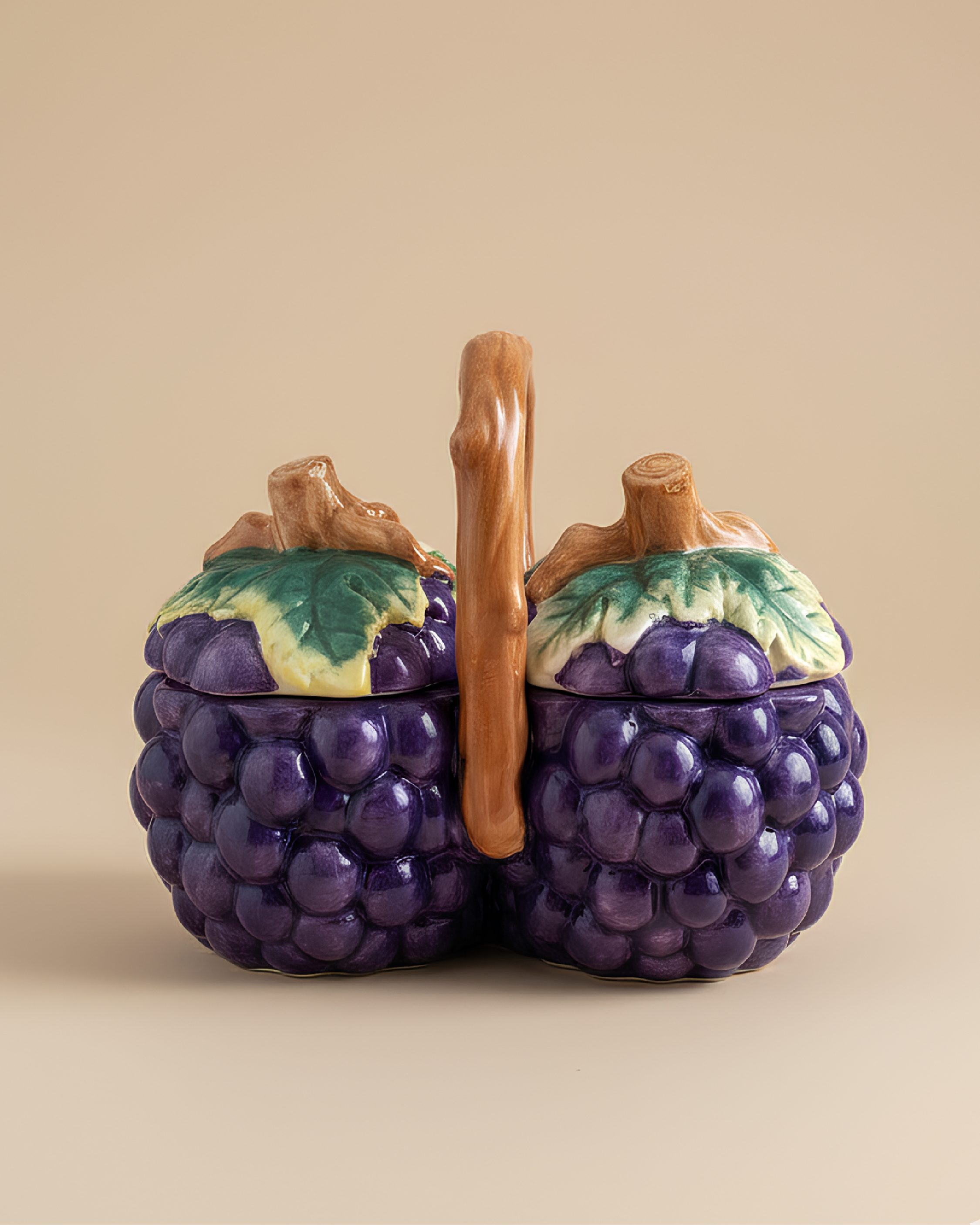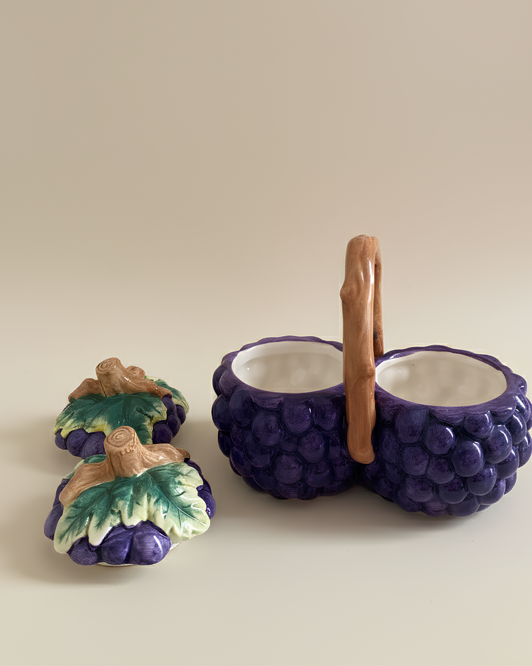 Piccolo contenitore decorativo a forma di grappolo d’uva, ideale come salsiera o porta marmellata. Perfetto per colazioni, brunch o tavole country chic.